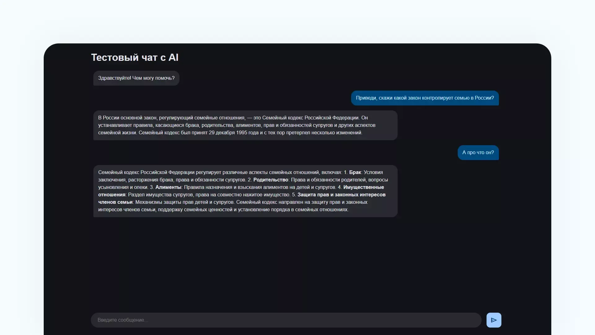 - Умная очистка диалога: Бот понимает фразы вроде "забудь все" или "начнем сначала" и автоматически очищает контекст.