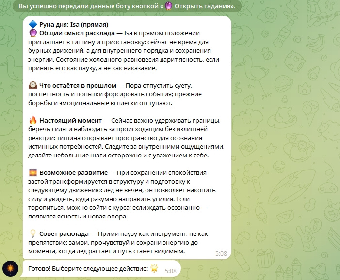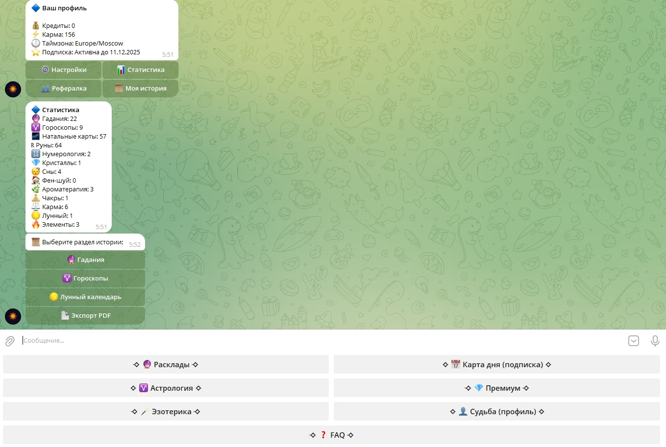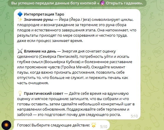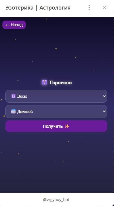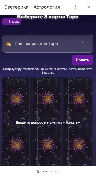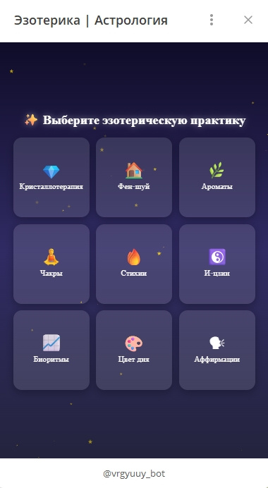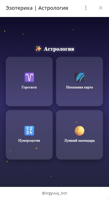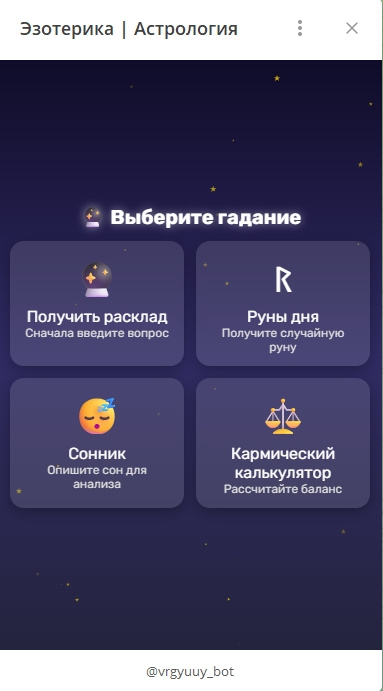 Этот бот — полноценный премиум-сервис для эзотерики, гаданий и астрологии.