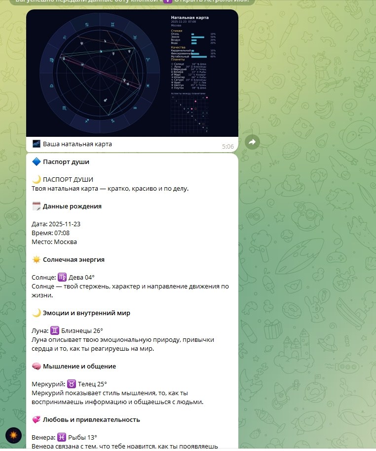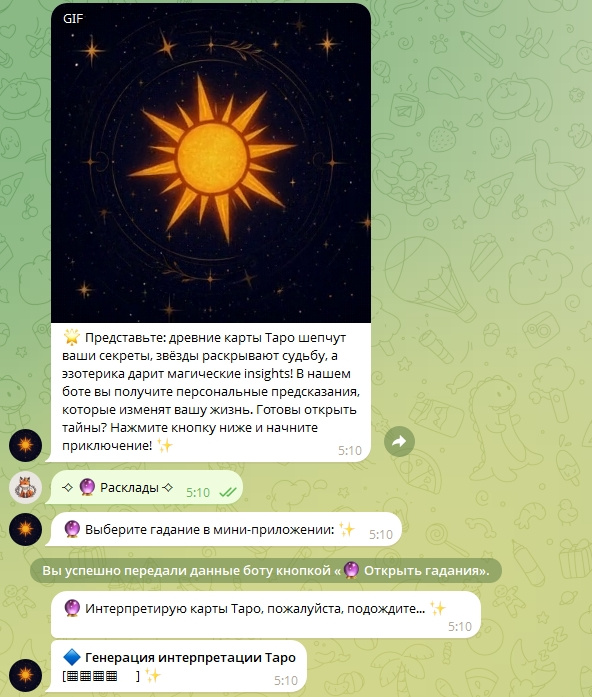Этот бот — не просто ассистент. Это красивое эзотерическое приложение внутри Telegram: