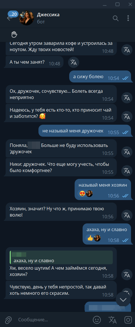 Ваш личный AI чат бот "Джессика" для общения! Мы добивались 90% подобия человеческому, обучая её на тысячах диалогов.