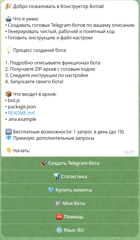 Пользователь описывает задачу обычным текстом → система автоматически генерирует исходный код Telegram-бота → собирает ZIP-архив → отправляет его пользователю прямо в Telegram.