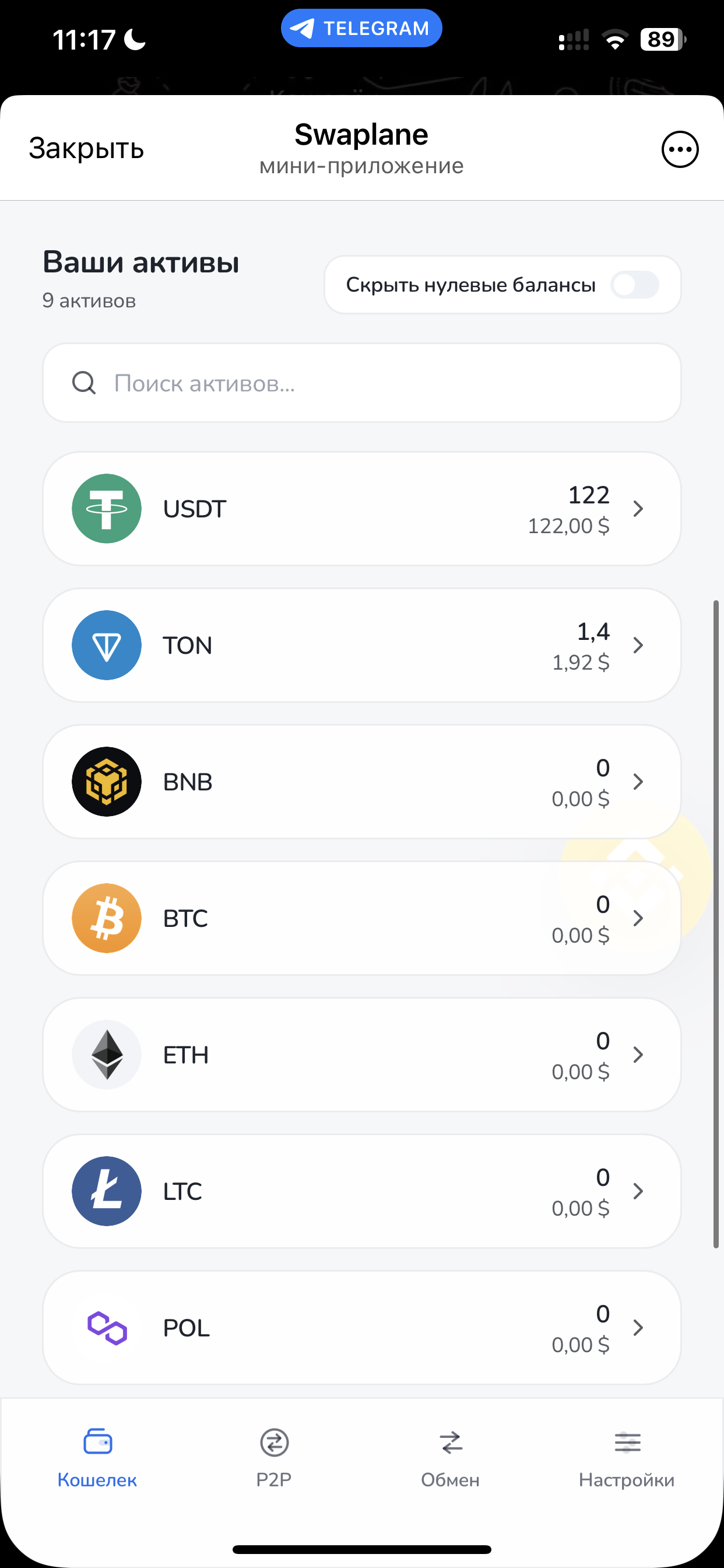 BTC, ETH, BNB, SOL, TON, TRX, LTC и USDT (поддержка практически во всех перечисленных сетях).