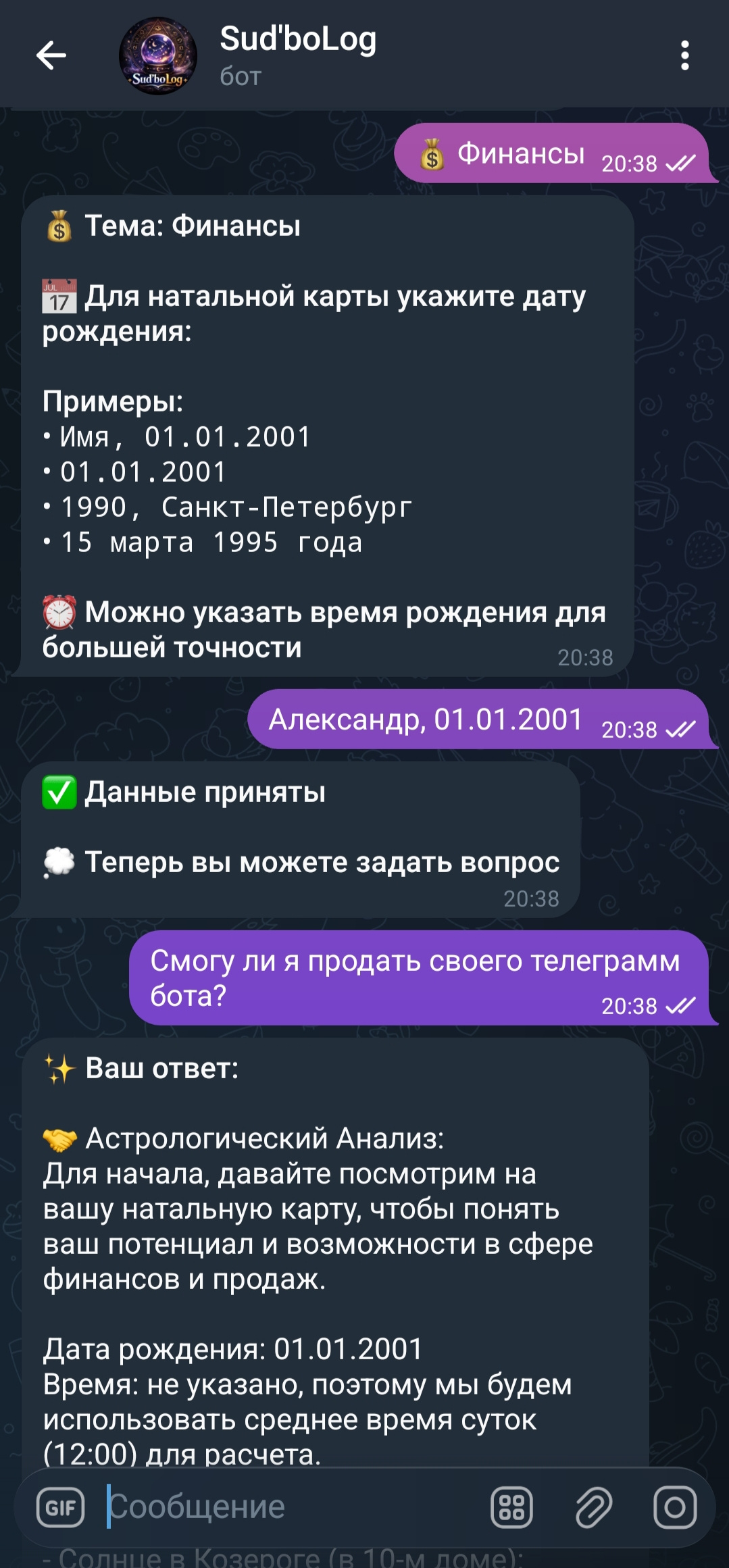 Это ваш личный цифровой экстрасенс, который в режиме 24/7 дает персонализированные гадания через три самых популярных метода: Таро, астрологию и расчет натальной карты. Пользователь получает глубокий, детализированный ответ, сгенерированный искусственным интеллектом на основе его запроса и данных (знак зодиака, дата рождения, конкретный вопрос).