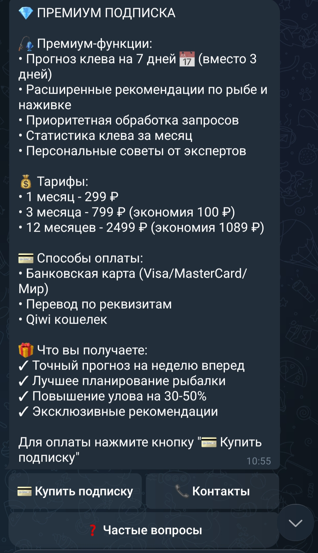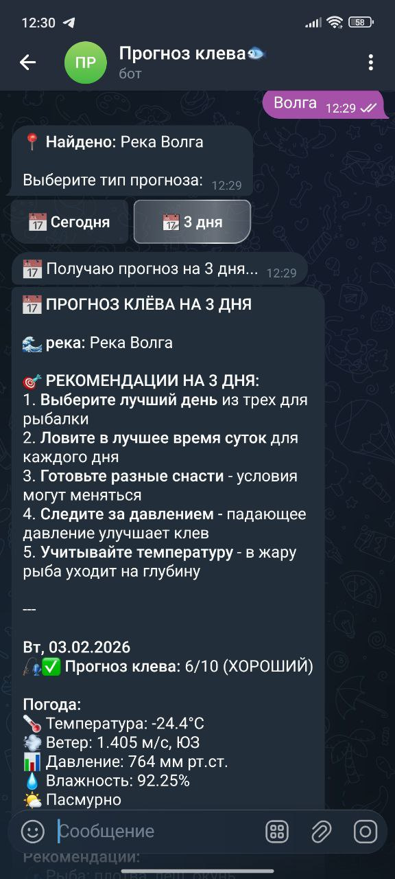 Единственный Telegram-бот в России, который анализирует 7 погодных факторов и даёт прогноз клёва на сегодня и 3 дня вперёд с рекомендациями по рыбе и наживке!
