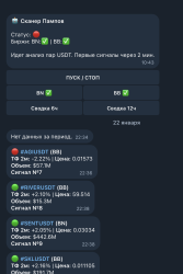 Уникальный бот для отслеживания Пампов на криптобирже. Настраивается под Бинанс и Байбит. Присылает сигналы когда на бирже увеличиваются объемы торгов по биткоину и другим популярным парам. Также есть сигналы для альткоинов. Зачем нужны эти сигналы? Они помогают принимать решения о входе или выходе из позиции на основании всплесков активности трейдеров.