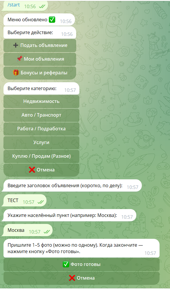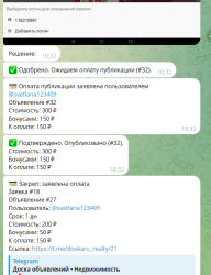 Продаётся готовый Telegram-бот для доски объявлений: подача объявления → модерация → публикация в тематические каналы. Монетизация уже встроена: платная публикация и платный закреп, плюс бонусы/рефералы.