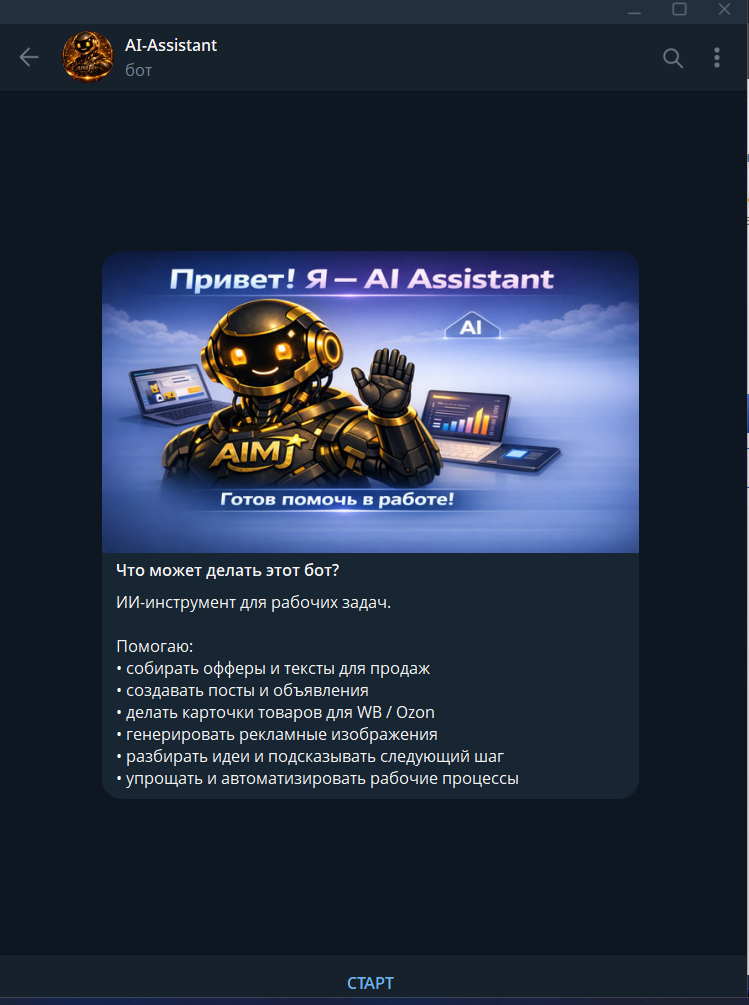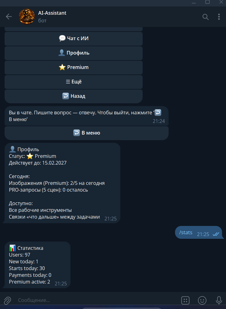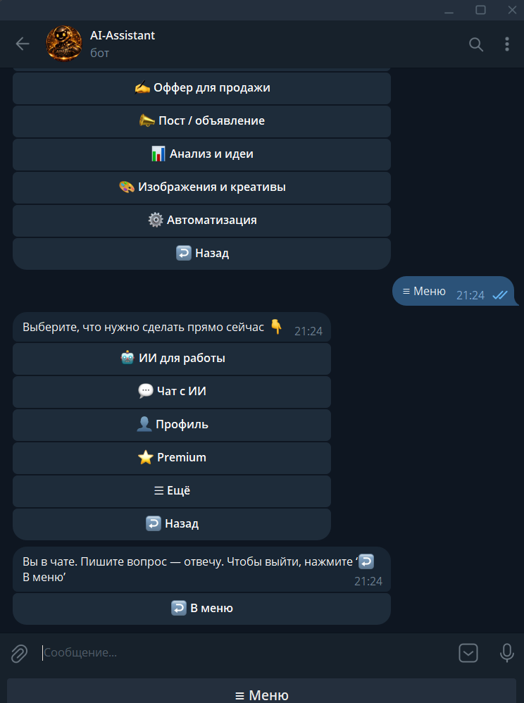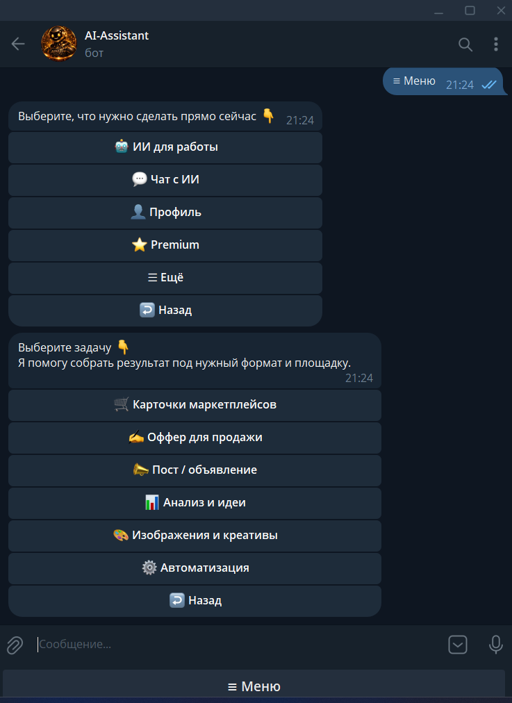 Продаётся Telegram-бот AI-Assistant — ИИ-инструмент для реальной работы, а не «чат ради чата».