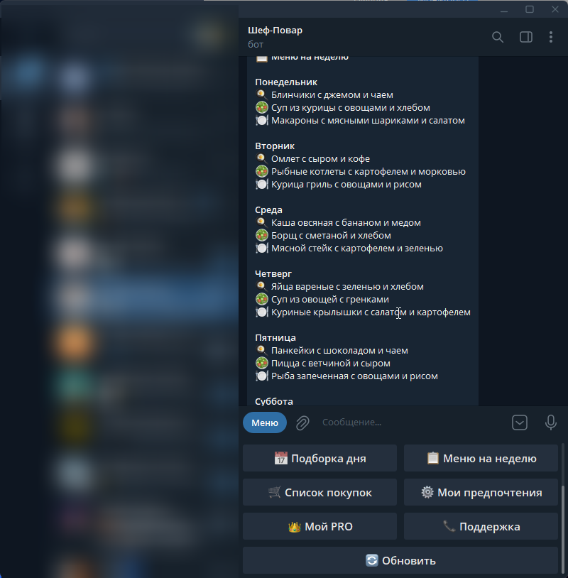 - Недельное меню и список покупок (для PRO).