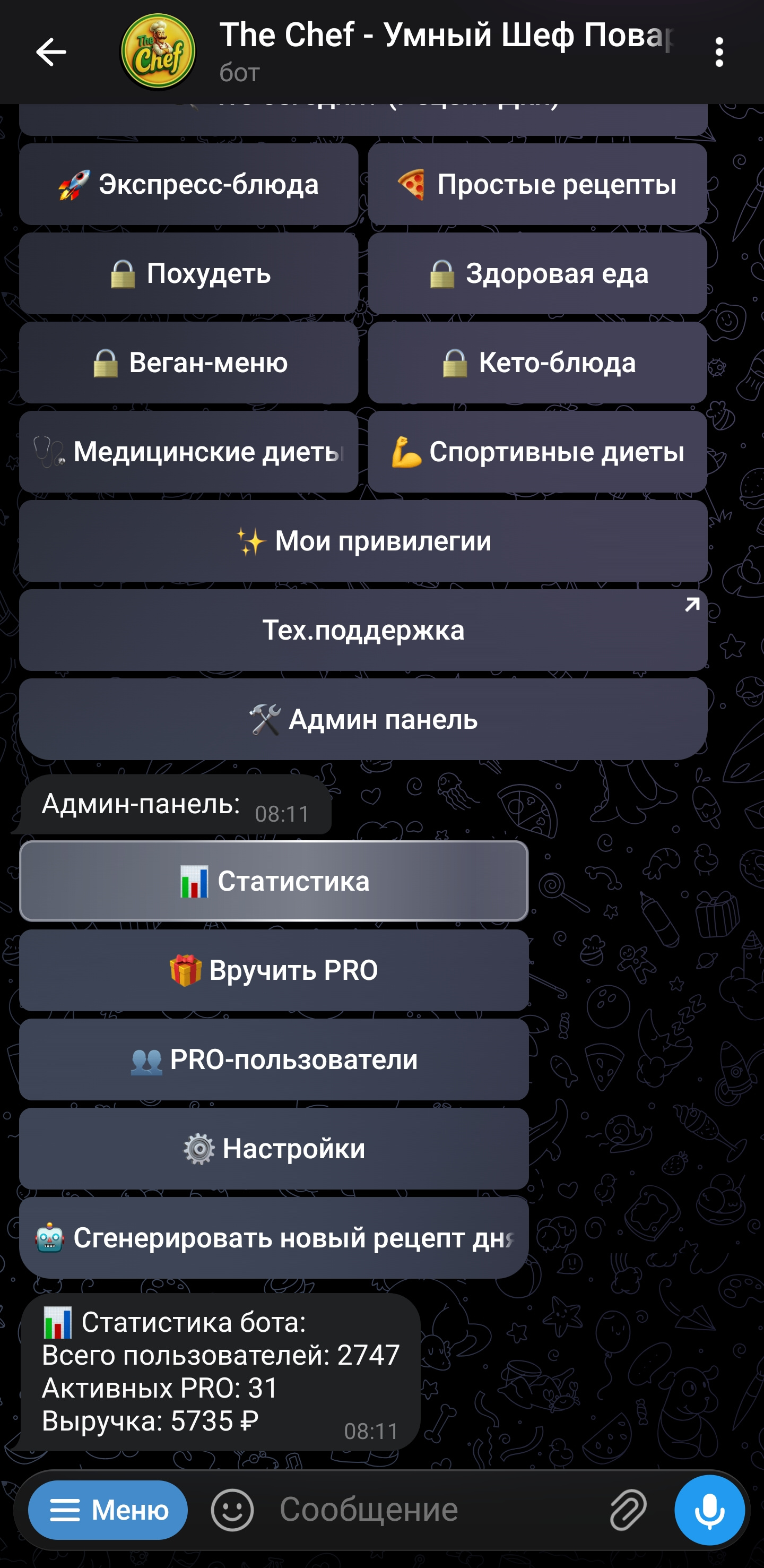Бот в телеграм Шеф повар с встроенной нейросетью. Генерирует рецепты на любом языке.