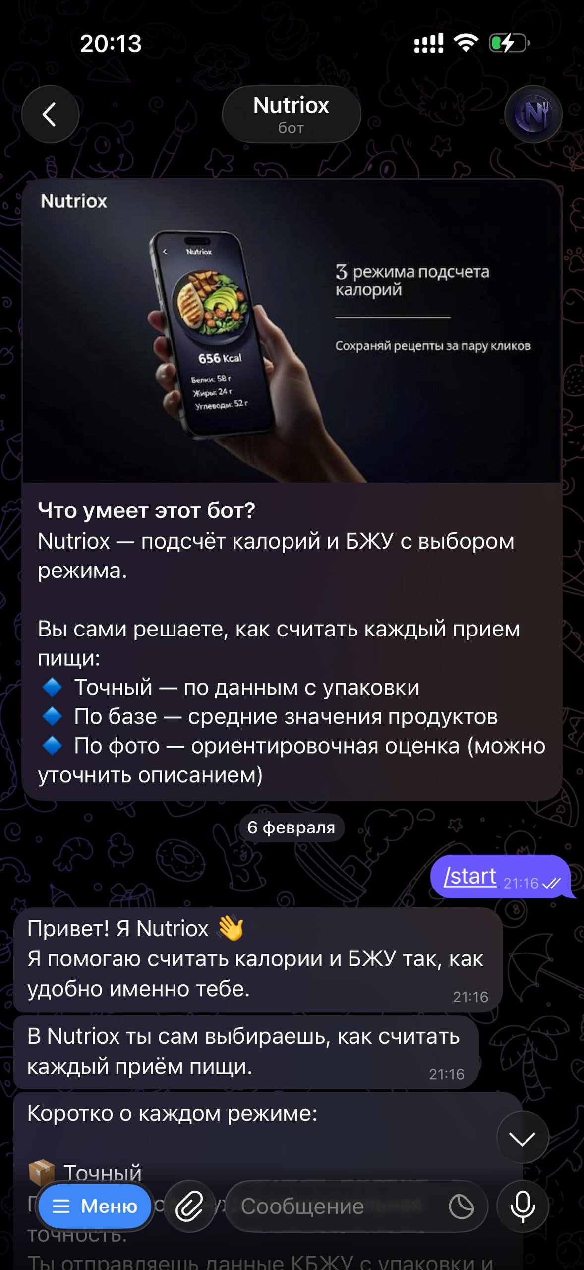 Telegram-бот для подсчёта калорий и макронутриентов (КБЖУ) с несколькими режимами работы: