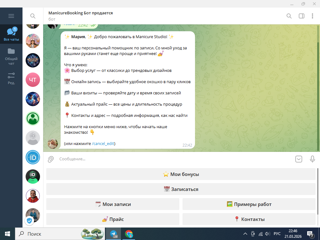 Встроенная программа лояльности: Бот сам начисляет кэшбек (бонусы) за визиты и показывает баланс. Это мощнейший инструмент, чтобы клиенты возвращались только к вам!