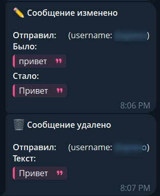 - Уведомления об изменённых сообщениях (было/стало) с показом медиавложений