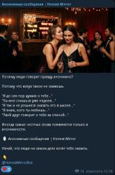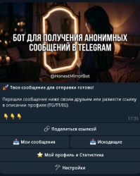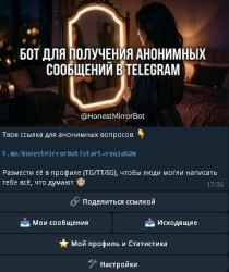Проект — Telegram-бот Анонимные сообщения | Honest Mirror , предназначенный для получения анонимных сообщений от пользователей. Основная идея — дать людям возможность честно высказываться без страха и давления, а получателю — узнать мнение, признания и обратную связь.