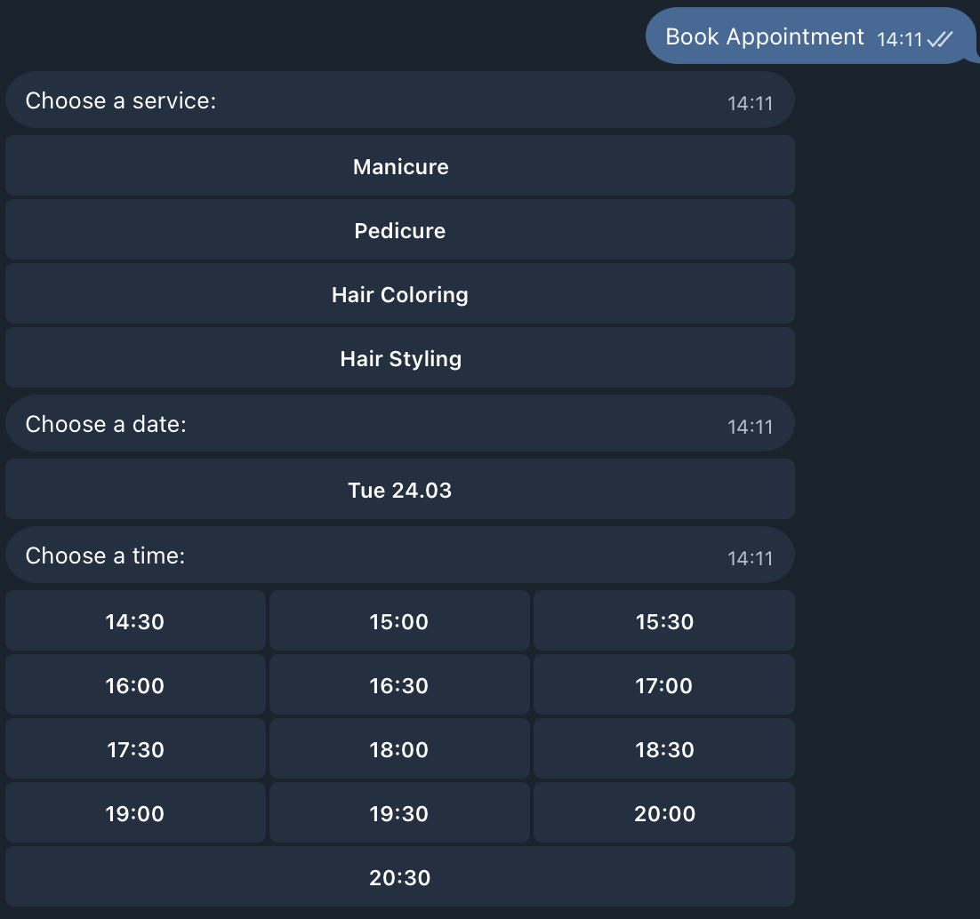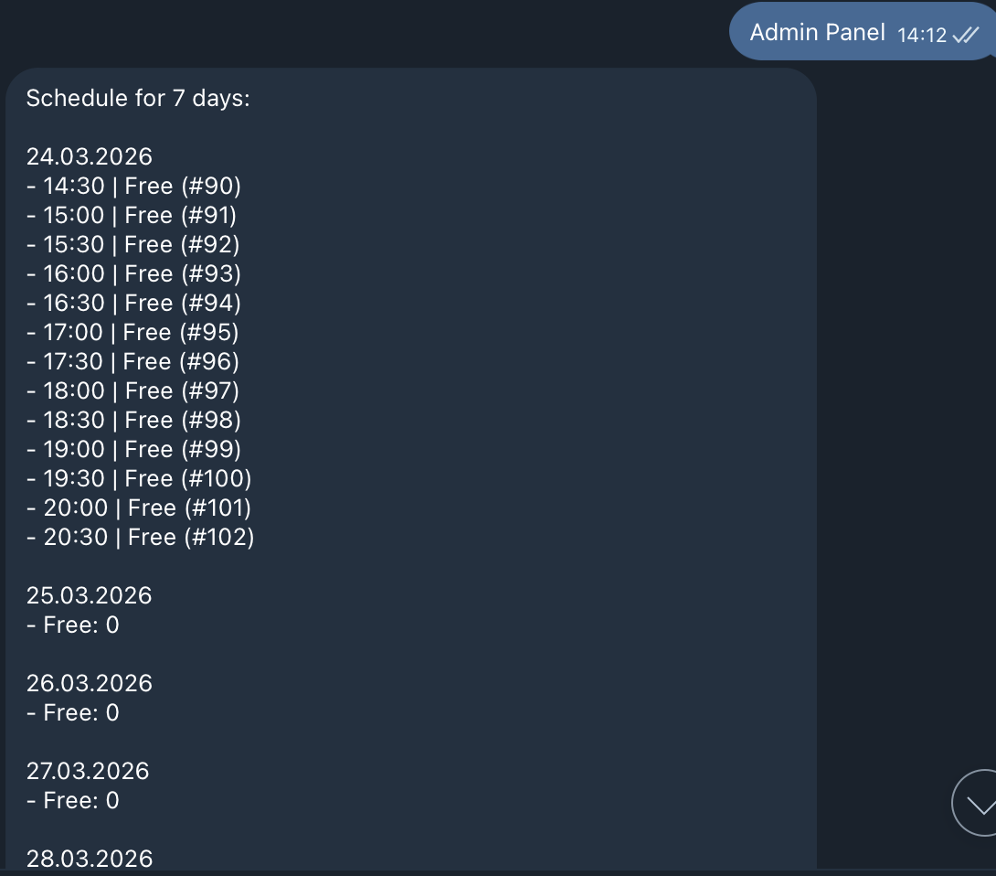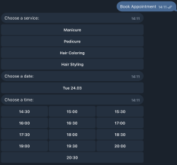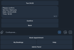 Он особенно подходит для демонстрации будущего сервиса мастерам, салонам и частным специалистам, потому что наглядно показывает, как может работать запись в автоматическом режиме прямо в Telegram.