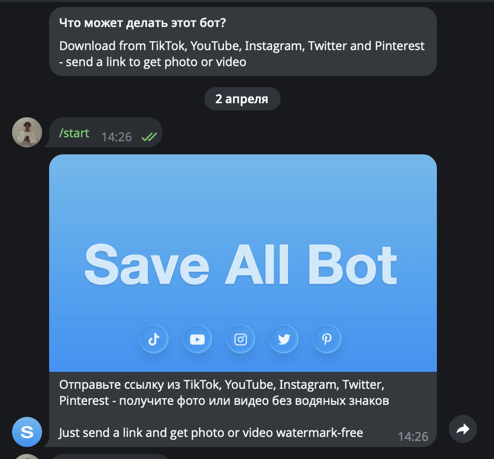 Всем привет, продаю Telegram-бота для скачивания медиаконтента. Бот умеет скачивать видео и изображения из различных социальных сетей: TikTok, YouTube, Instagram, X, Pinterest.За время работы им воспользовались более 270 000 раз