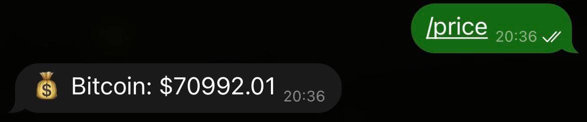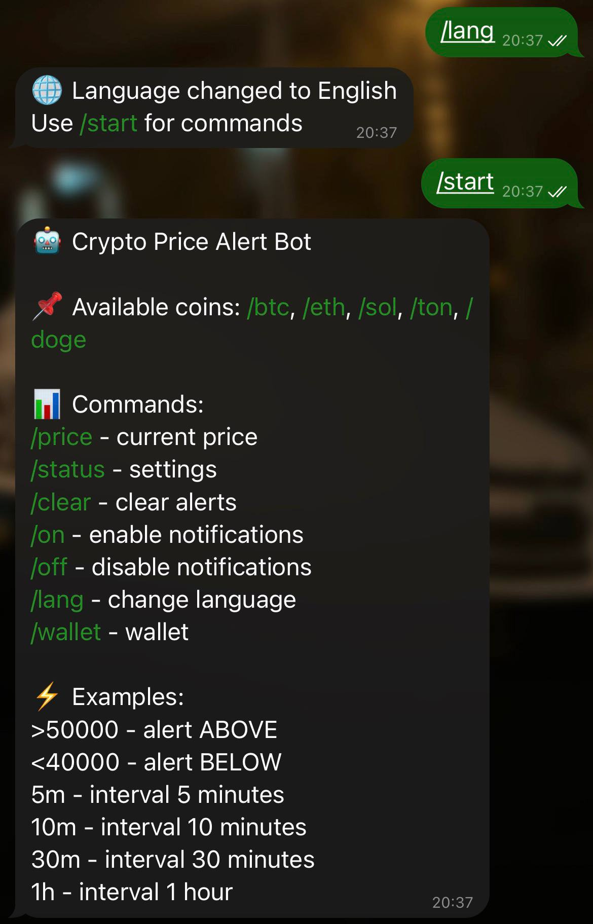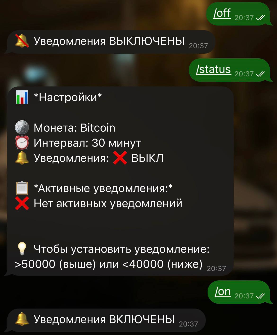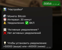 Настроить уведомления по времени, напишите ему 5min или 5м (пример, можно написать любое время) или 1ч (1hour), и бот будет отправлять вам актуальную цену криптовалюты