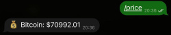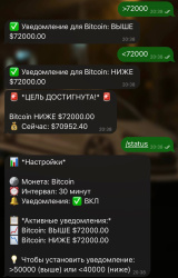 Возможность выставить алерты, напишите ему <72000 (любое число) и бот пришлет уведомление когда цена снизиться не смотря на время уведомлений.