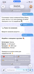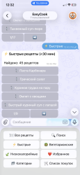Бот уже умеет: поиск, фильтры (быстрые, низкокалорийные, вегетарианские), избранное, список покупок с экспортом, случайный рецепт, ChatGPT в помощь по кулинарии.
