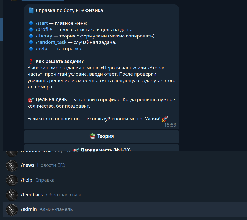 — Админ-панель в Telegram (добавление/редактирование задач, тем, рассылка, импорт Excel, бэкапы и т.д)