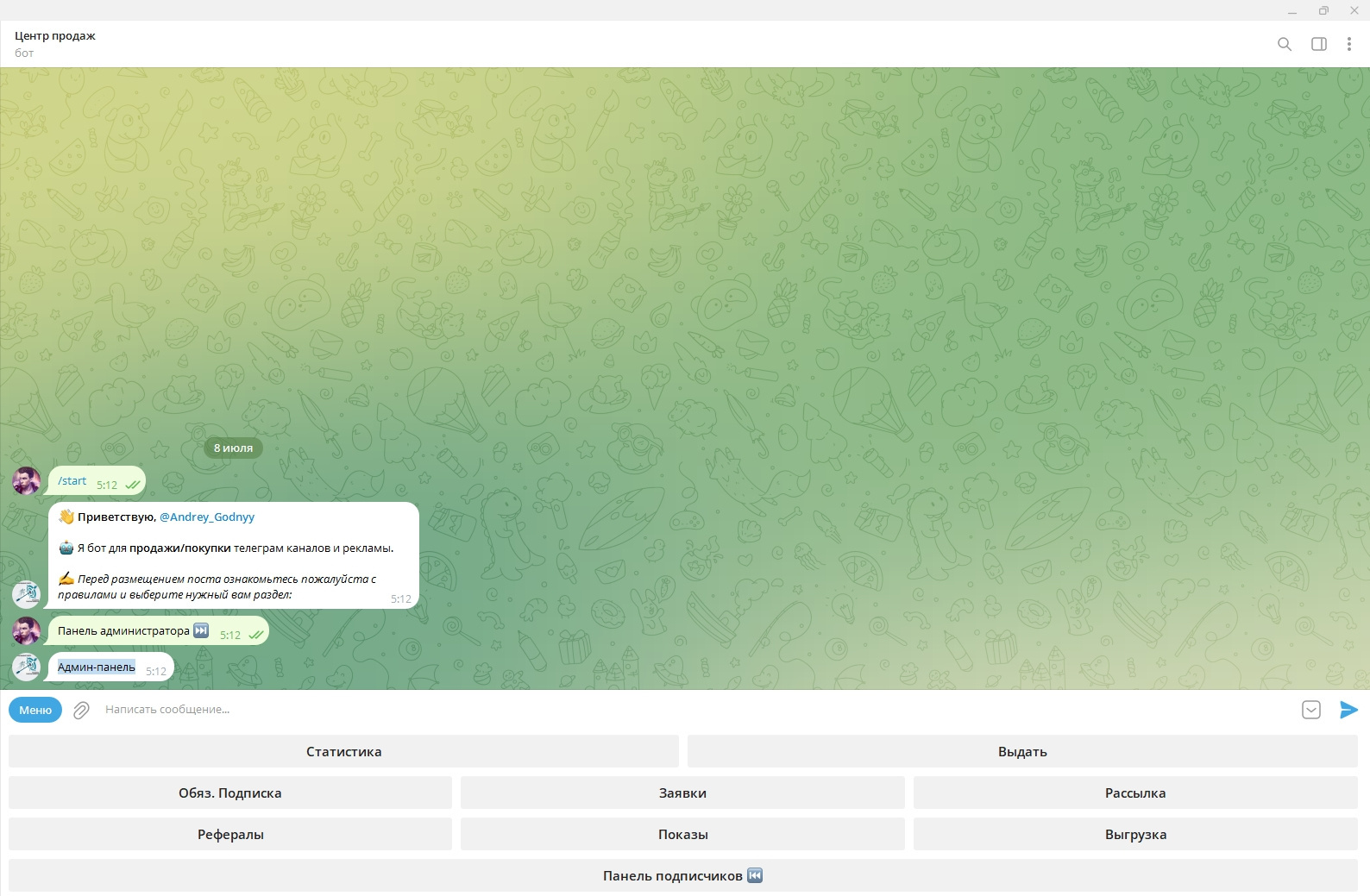 Смотрите прикреплённый скриншот административной панели бота.