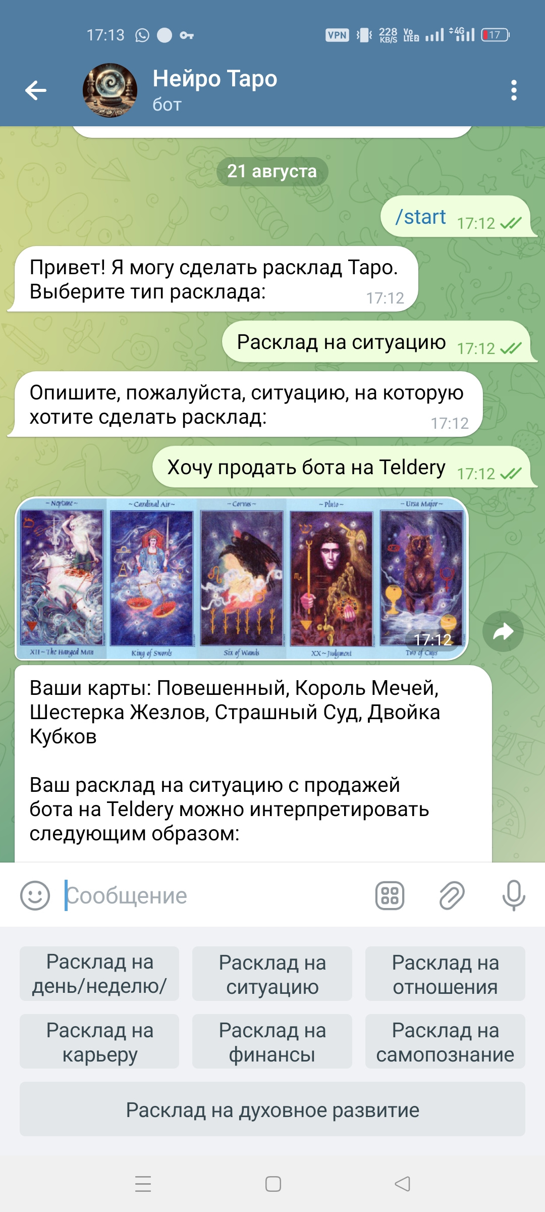 Этот бот - идеальное решение для предпринимателей, желающих заработать на растущем спросе на таро-расклады.