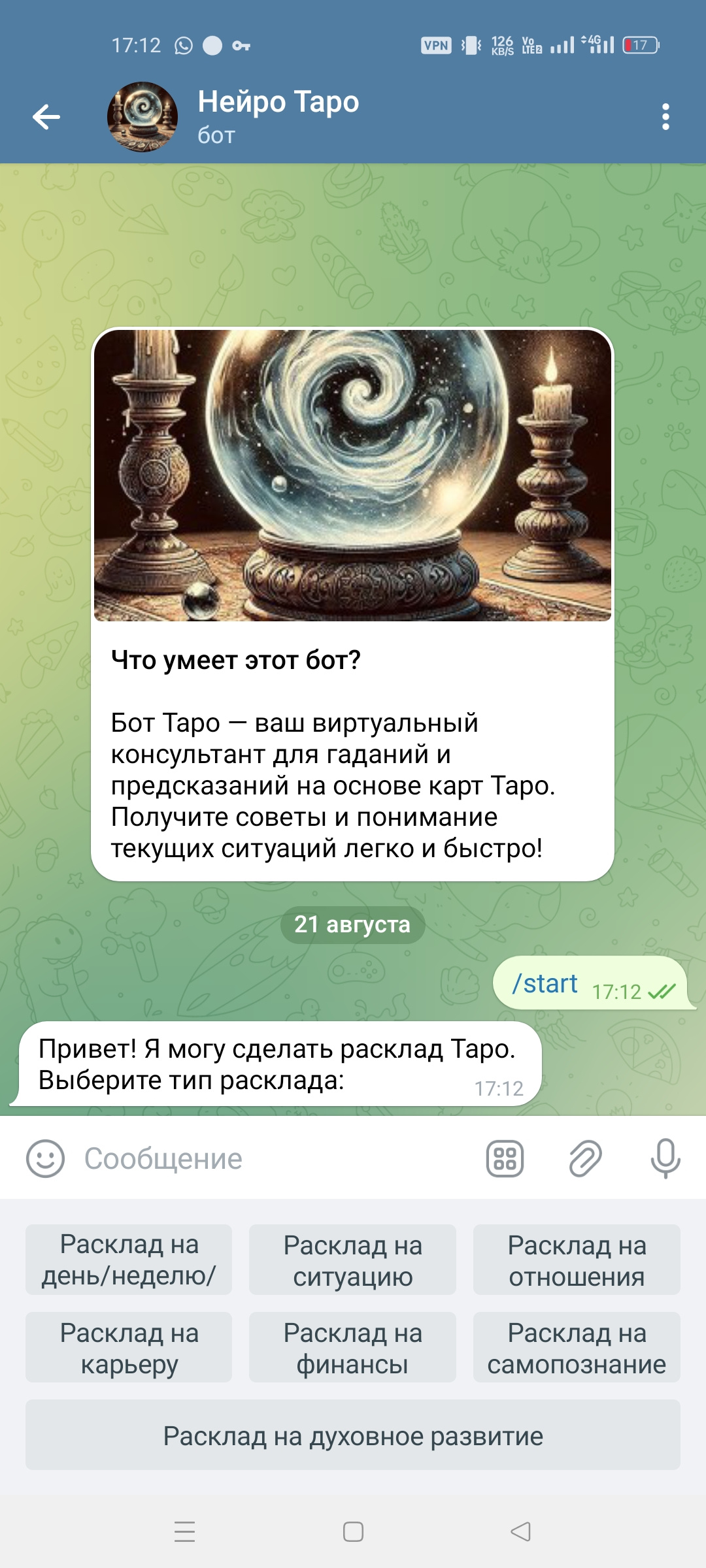 Представляем вам готовый бот Telegram, основанный на искусственном интеллекте, который предоставляет пользователям качественные расклады Таро, что является крайне популярной темой в настоящее время. Расклады делает на разные темы: