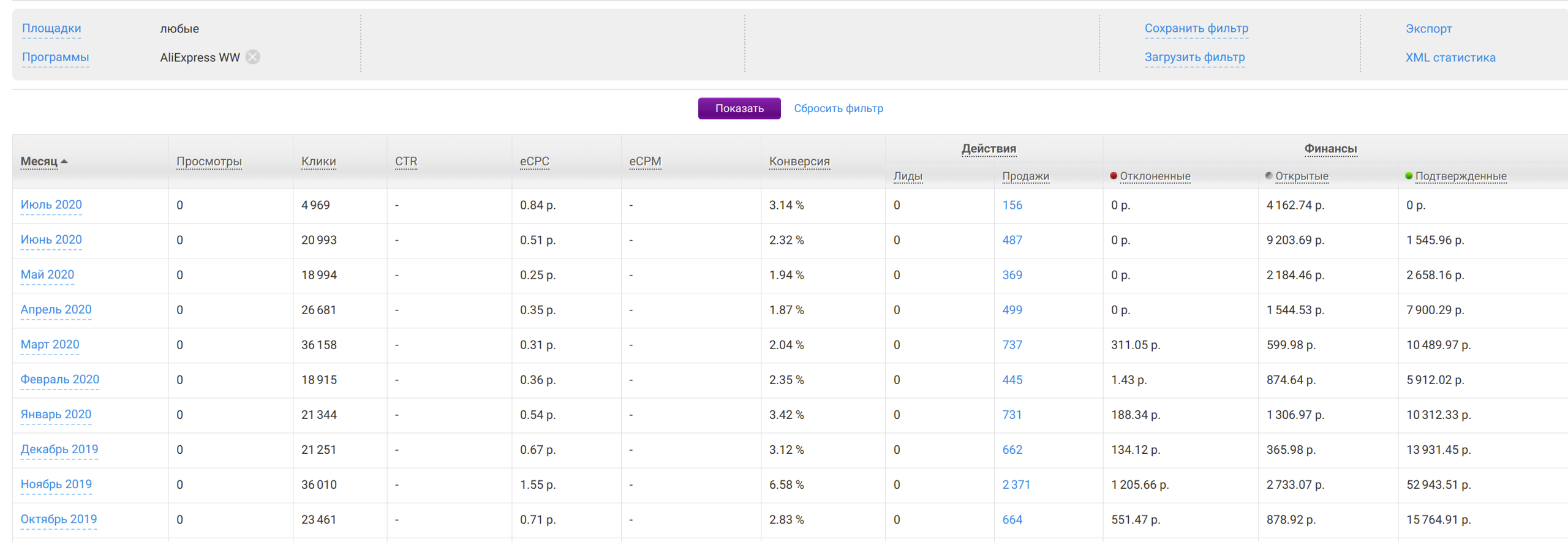 Скрин доходов прилагаю, важно у алика довольно длительное подтверждение около 45-50 дней, но процент апрува 97+% Поэтому суммируйте столбики "ожидаться и начислено"