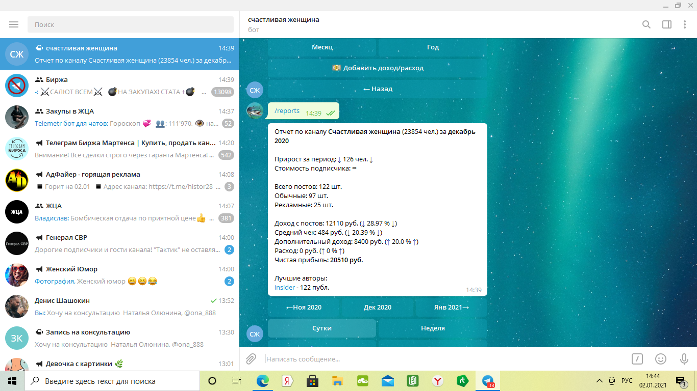 Продвигался рекламными постами в других ТГ- каналах с женской аудиторией.