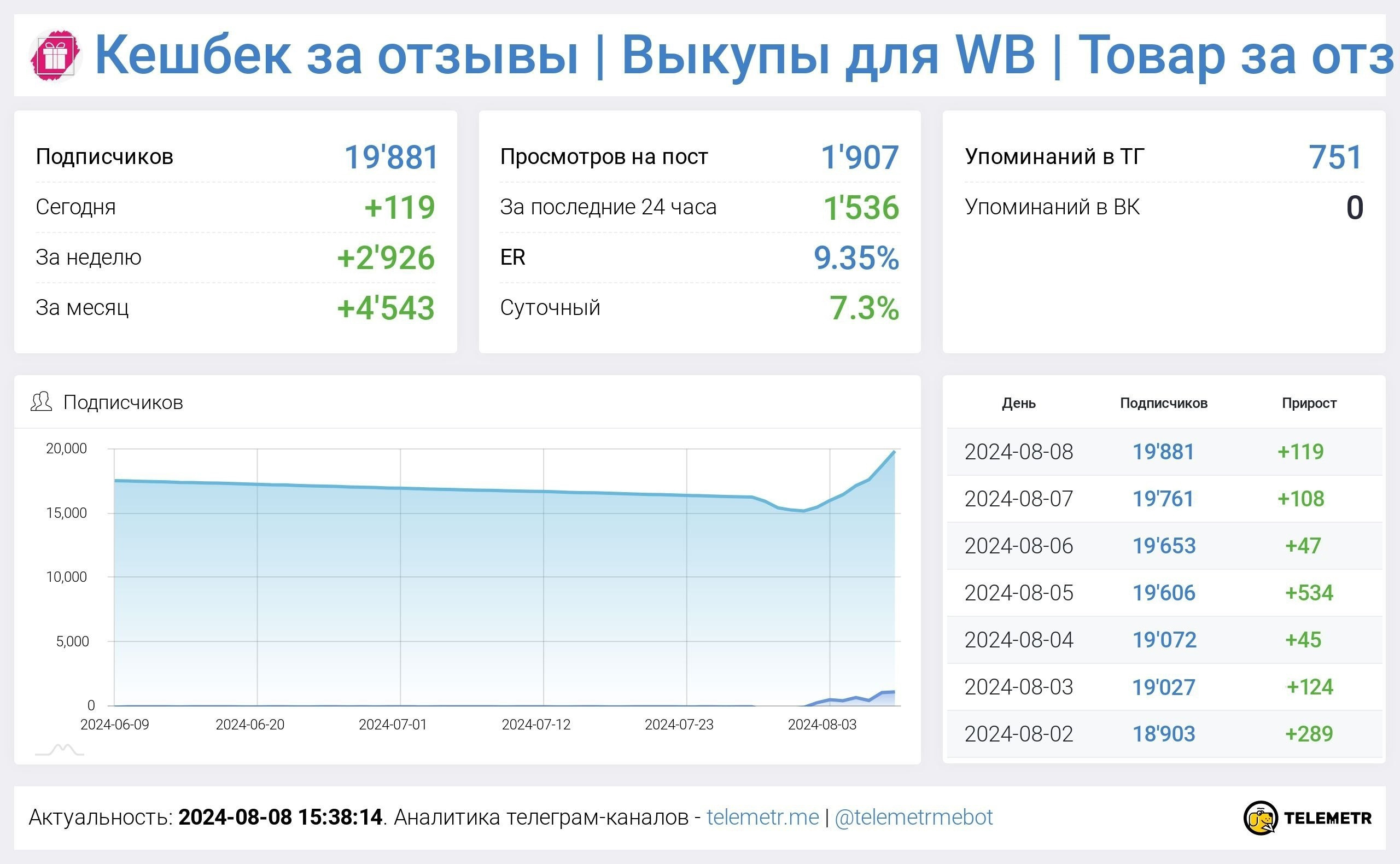 Канал развит с помощью покупки рекламы в телеграм каналах аналогичной тематики. Вся статистика закупов и продаж рекламы есть в сервисе Телеметр.