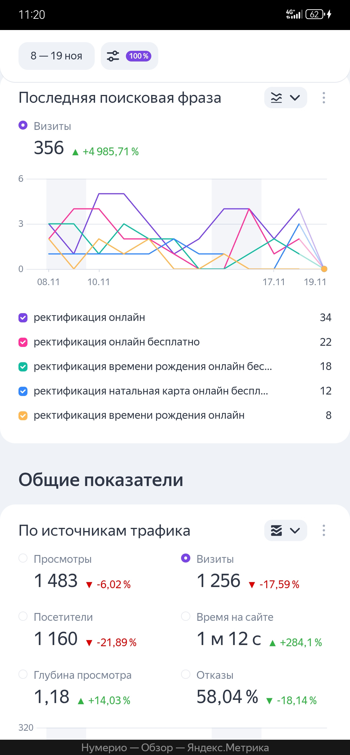 Основной трафик идёт по низкочастотным, но очень целевым запросам (Яндекс/Google):