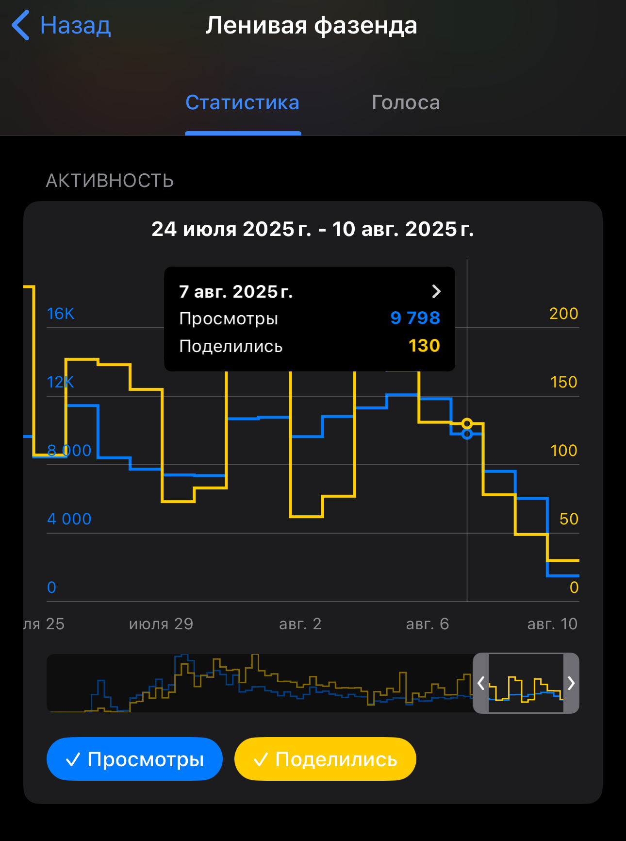 ✅ Суточные просмотры постов у меня 700 - 1000 ( это уже устоявшиеся просмотры ), при закупе рекламы, просмотры в канале становятся больше, а это =, что и цена на рекламу становится еще выше.