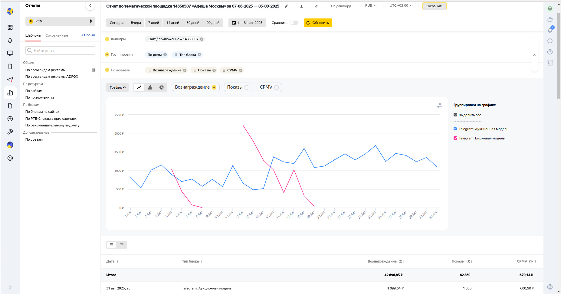 Реклама на канале продавалась автоматизированная через РСЯ + прямые посты. Скрины доход от РСЯ приложила ниже. Прямую рекламу продавали также через внешние запросы, при желании канал можно также добавить в telega.in для увеличения дохода. У нас многие слоты были заняты РСЯ, если заняться заполнением рекламных мест от прямой рекламы, то доход можно кратко увеличить. Искать прямых рекламодателей можно через через региональные чаты / подборки каналов от разных агенств и т.д. (покупателю все расскажу, заниматься у самой всем одновременно не хватало времени). Продажа прямой рекламы в среднем идет по 2000 cpm, от РСЯ cpm в среднем около 700-800 (но автоматически само и каждый день выходит + само делает маркировку). Цена при прямой продаже за пост 1400-1700 руб.