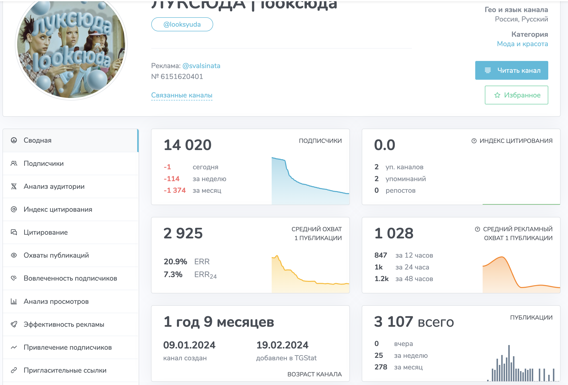 Целевая аудитория канала — преимущественно женщины и мужчины 18–45 лет, активно интересующиеся модой, отслеживающие тренды и стремящиеся выглядеть стильно без лишних затрат.Канал регулярно обновляется, его контент ориентирован на лёгкое усвоение, а аудитория отличается высокой вовлечённостью и готовностью пробовать новые идеи.