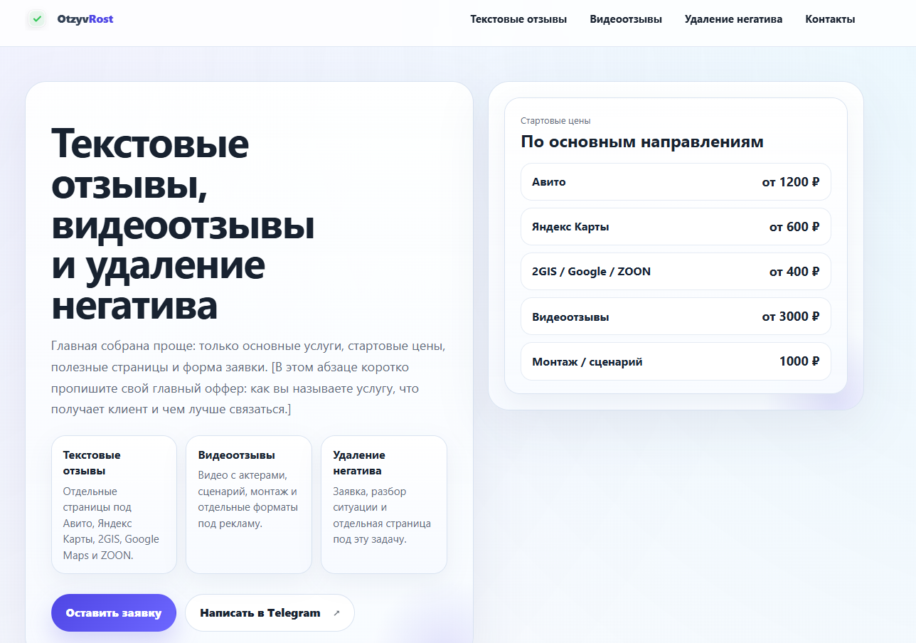 Что входит в стоимость: Telegram-канал (720 чел.) + 35 активных заказчика + ТГ-бот на конструкторе (250 лидов в базе) + Сайт с формой заявок (для сбора органики).