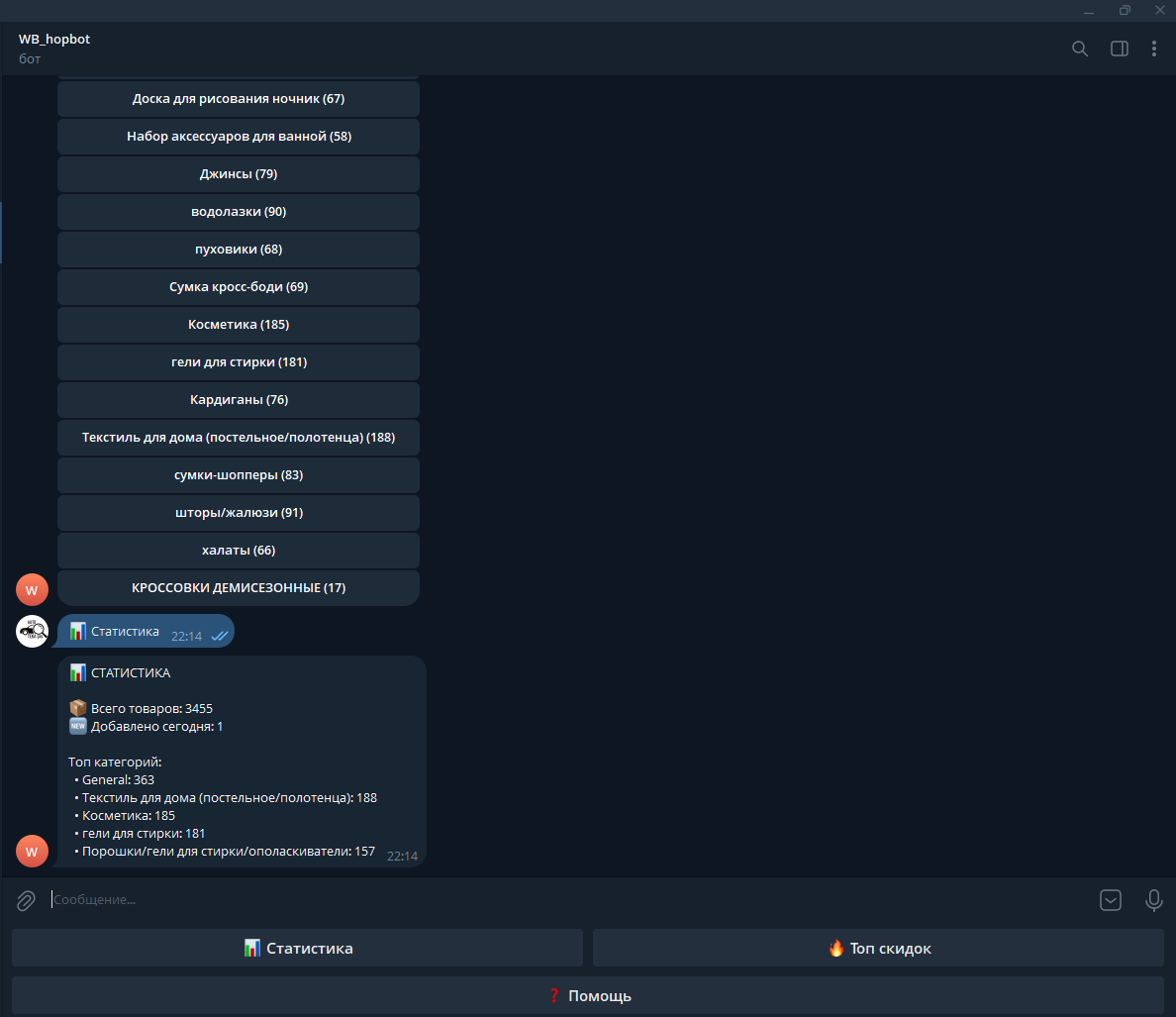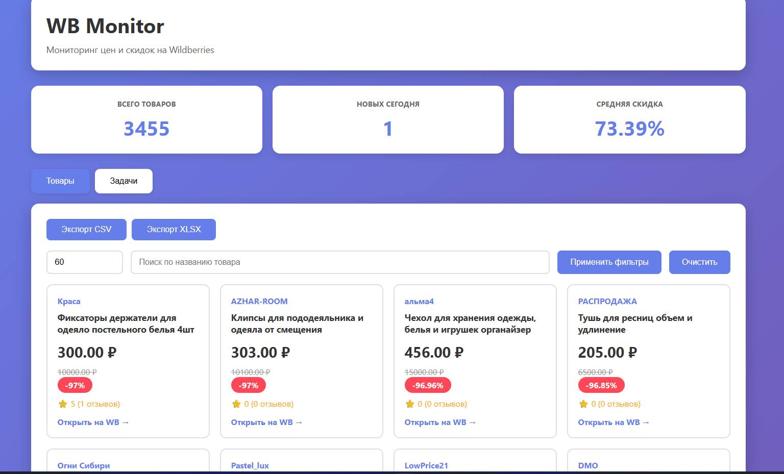- Настройка фильтров (минимальная скидка, ключевые слова)