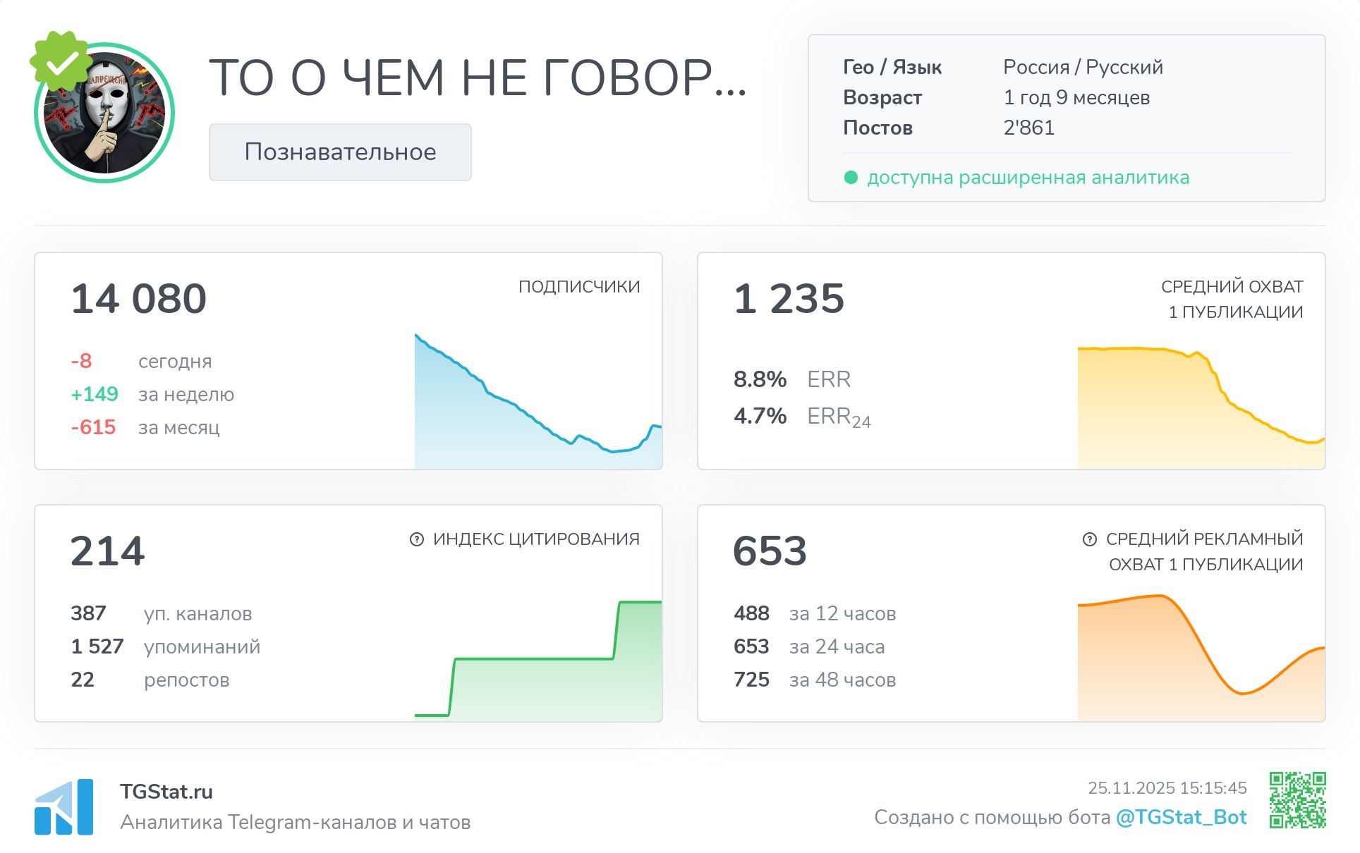➡️ В канале 0 ботов, закуп ботов никогда не производился. Сервис аналитики каналов Telemetr.me говорит о том, что Упоминаний в ТГ - 1321. Это означает то, что канал упоминали другие каналы 1321 раз.