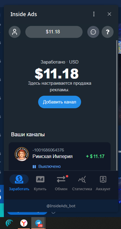 - InsideAds 10-50$ (подключена 2 месяца, в основном ставлю рекламу, если не вышел пост от РСЯ)