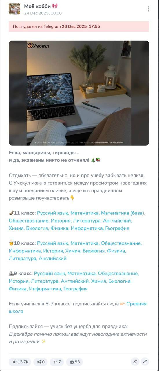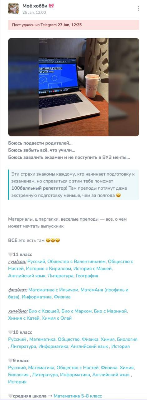 Среди рекламодателей — онлайн-школы и проекты по подготовке к ЕГЭ и ОГЭ, бренды и продавцы с WB и Ozon, товарные проекты, подарки, хобби-товары и другие Telegram-каналы. Это платёжеспособные клиенты, которые готовы покупать размещения регулярно. Есть постоянные внутренние и внешние заказчики. Канал добавлен в перечень РКН и подключён к бирже Telega.in.