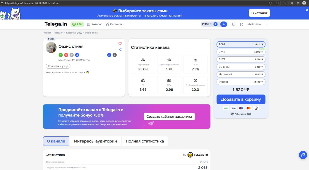 Также телеграм канал подключен к бирже которая имеет свою базу постоянных покупателей.