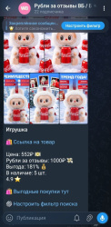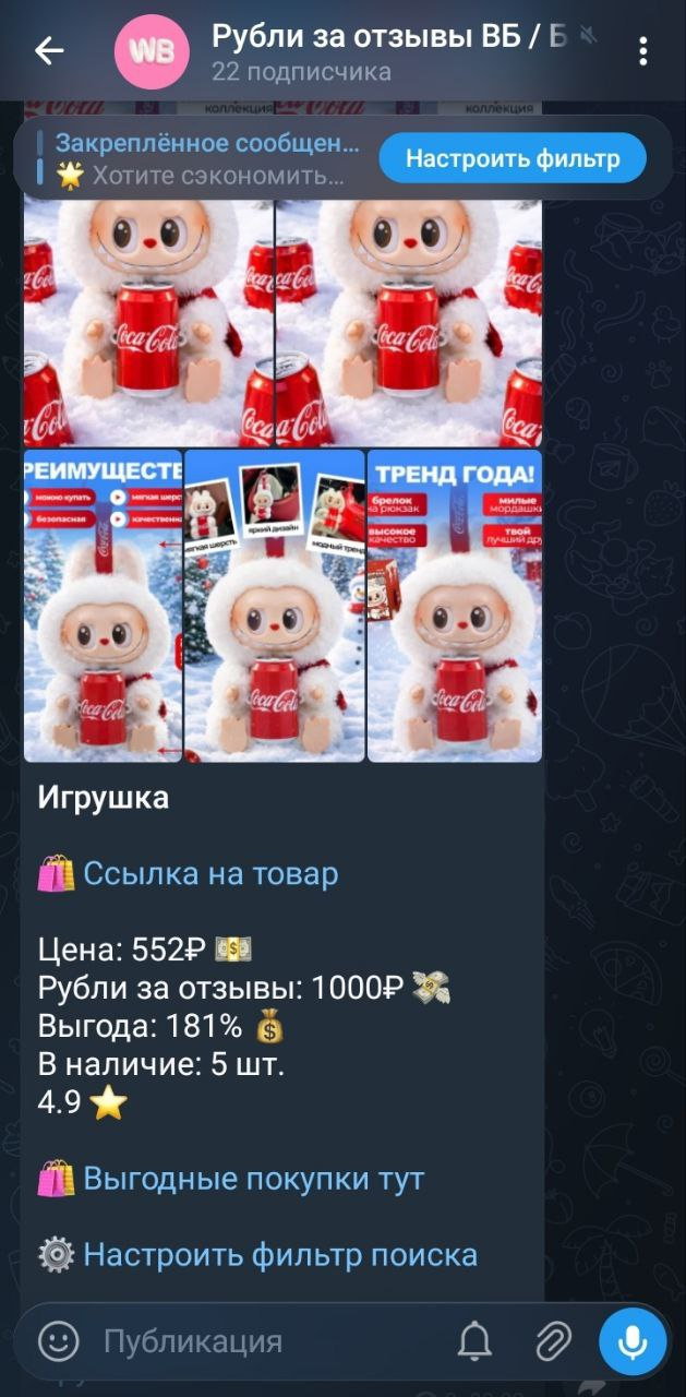 В канале публикуются товары из акции *Рубли за отзывы WB* которые можно приобрести с скидкой. Монетизация проходит в боте за счет приобретения подписки для уведомления по выбранным категориям. Оплата подписки доступна звёздами в Telegram или на кошелек ЮMoney.