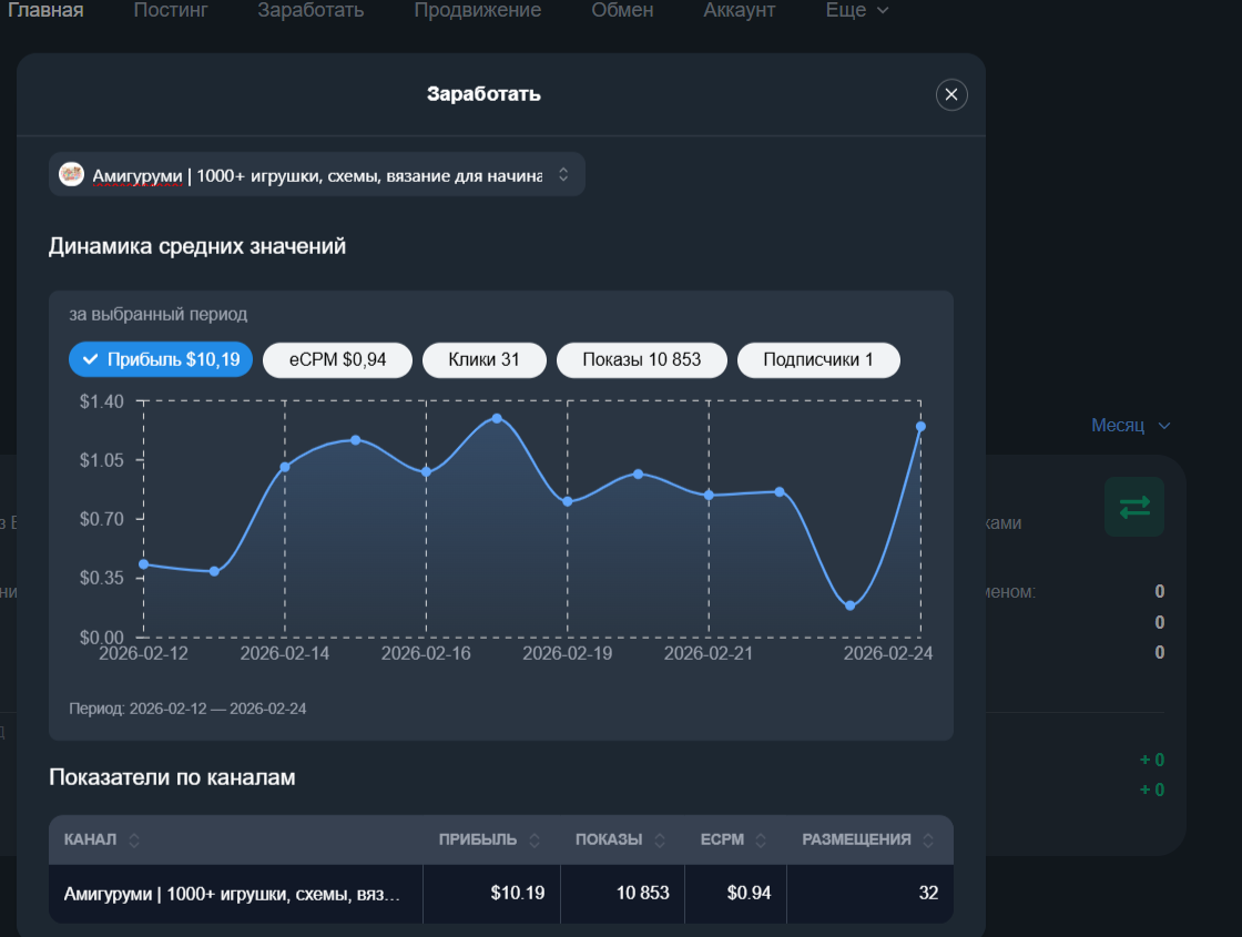 Доход: если продавать рекламу напрямую, то это в среднем 3 рекламных размещения в день по 500-1000 р. за 1 место, то есть в среднем максимальная прибыль с канала — 2250 в день, а в месяц — больше 60 000 рублей.