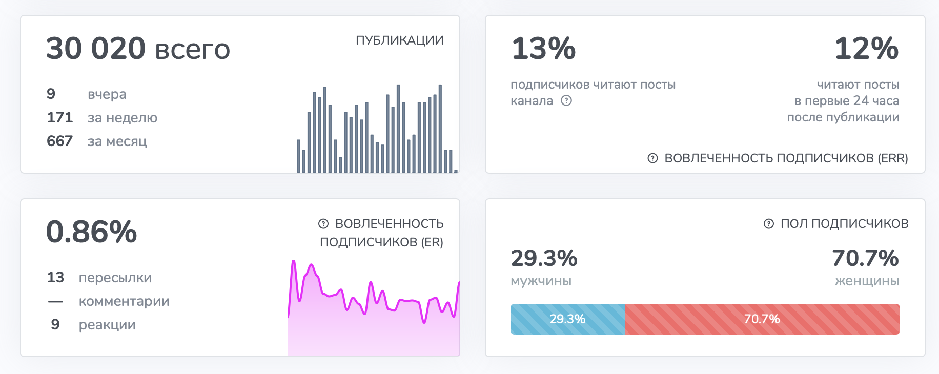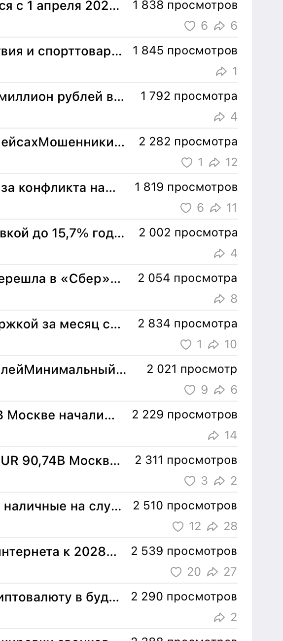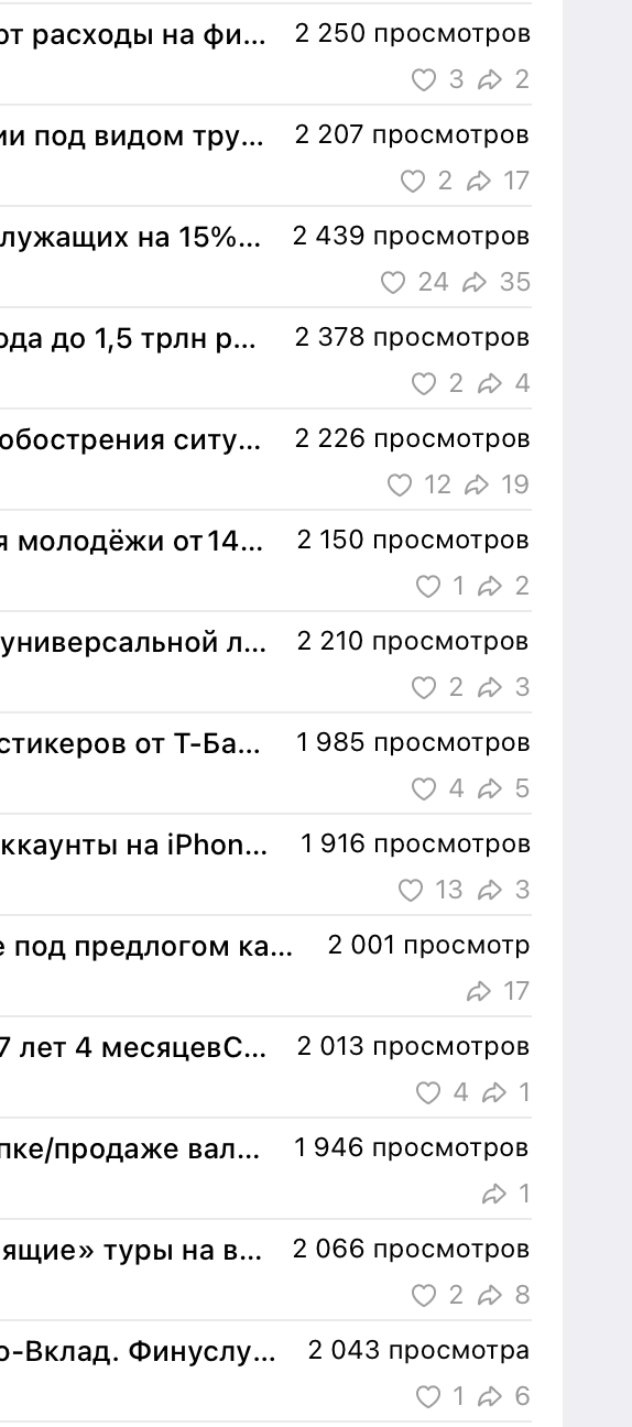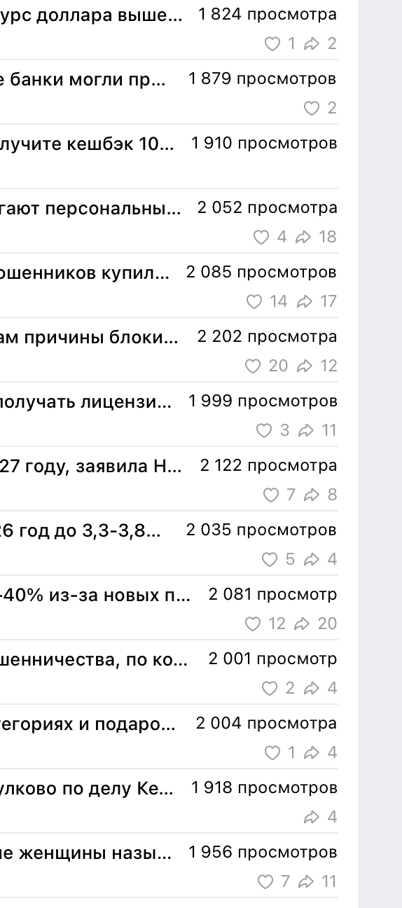 Наш канал имеет качественную, взрослую, платежеспособную аудиторию, которая заинтересована данной тематикой. Об этом говорят постоянные просмотры и вовлеченность подписчиков. Например, некоторые каналы с 50К+ подписчиками имеют столько же просмотров или даже меньше. Это доказывает качество нашей аудитории. При этом у нас ежедневная новостная повестка, от 15 постов в сутки, что, как правило, должно негативно отражаться на просмотрах. Но только не у нас! Это достигнуто за счет качественной подачи материала, структуры и концепции, которой мы придерживаемся. Мы не выкладываем всякий экономический мусор, хайп и прочие новости, которые разлетаются ради просмотров. Мы за качество!