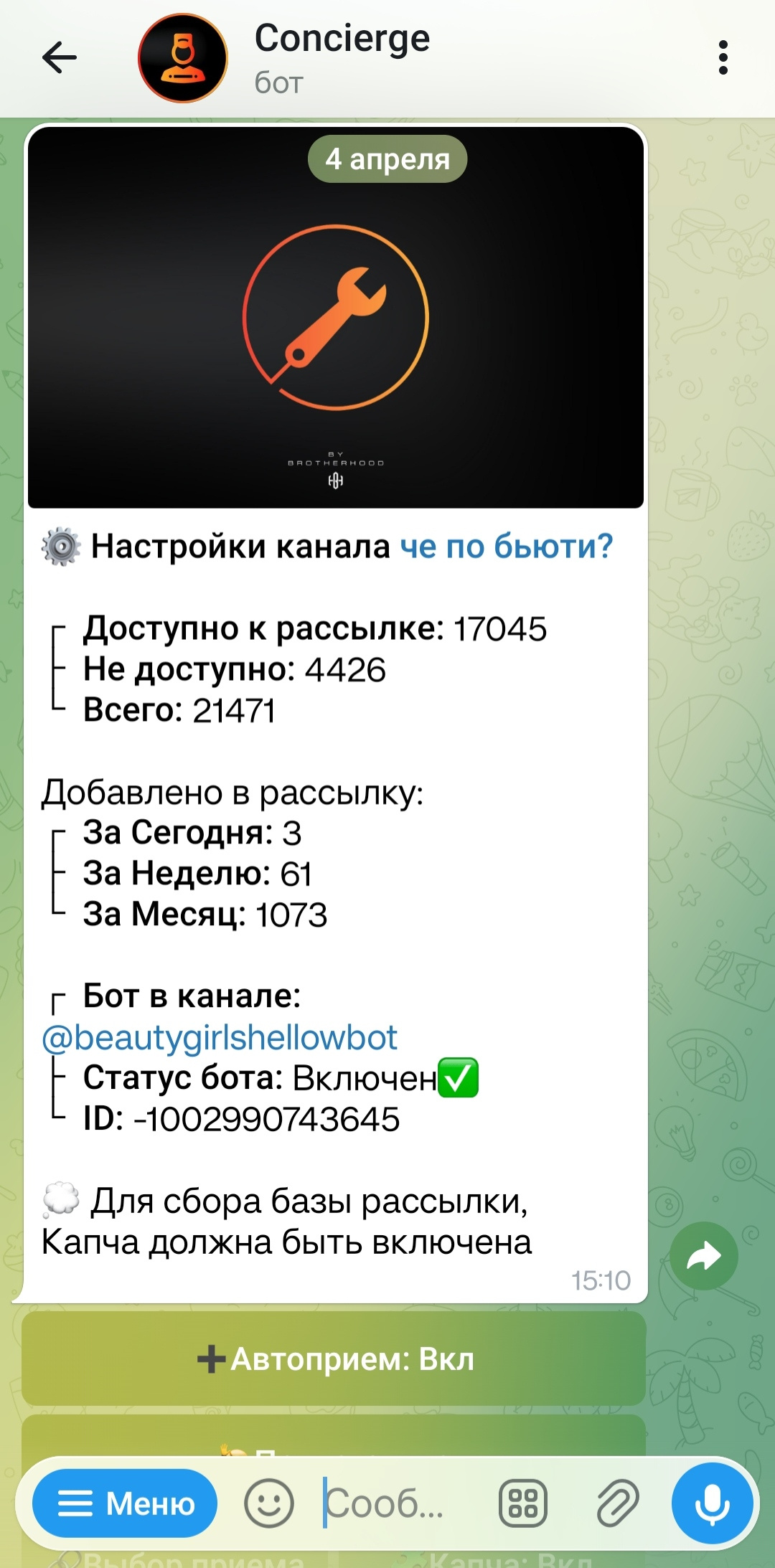 Доп. доход: подключенный приветственный бот и продажа рекламных рассылок по базе бота.