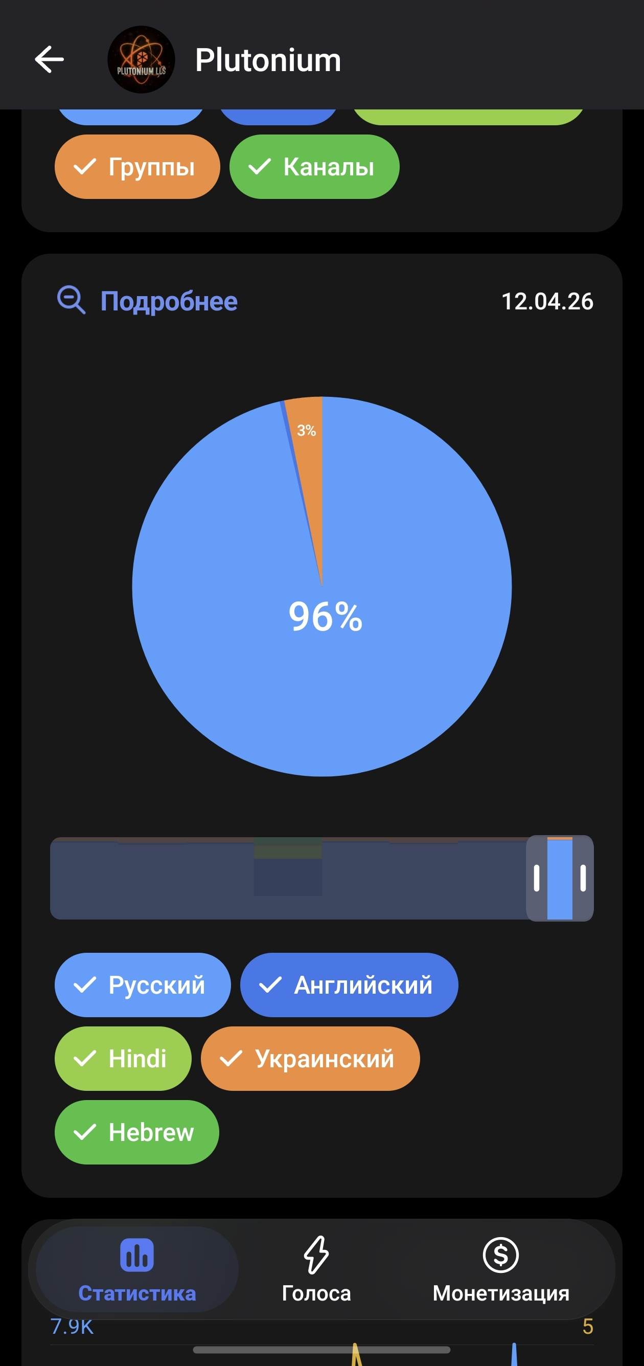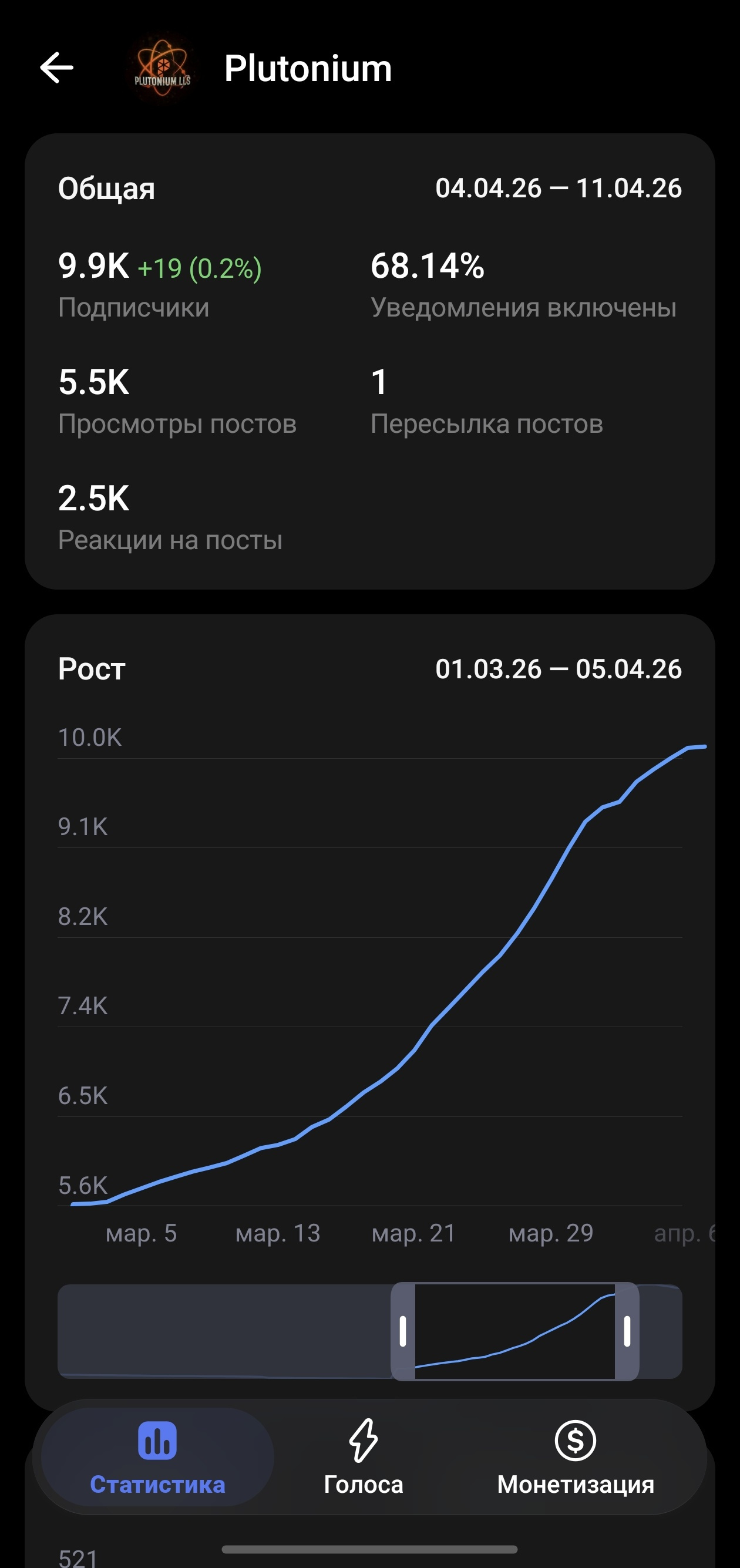 Бот - 11700 пользователей (отображается), во время поддержки по +-400 новых пользователей, в данный момент без поддержки +-200 пользователей в день, бот сделан в конструкторе, также предоставлю при надобности после преобретения канала.