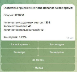 1. Telegram-бот @nanobananos_bot — флагманский бот, приносящий основную прибыль. В нем можно генерировать картинки и там же делать с ними видео. Вот данные по нему: в базе данных 52 000+ человек, из них 13 600 пользовались ботом и делали генерации (26%), 538 человек делали покупки (1,03%).