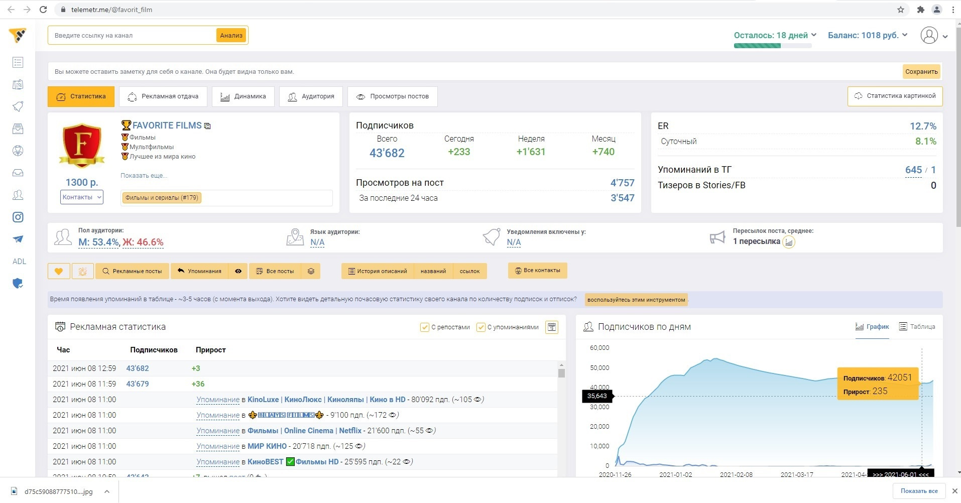 Раскрутка:Канал развит на покупке рекламы в каналах Телеграмм аналогичной тематики. Вся статистика закупов и продаж есть в сервисе Телеметр.