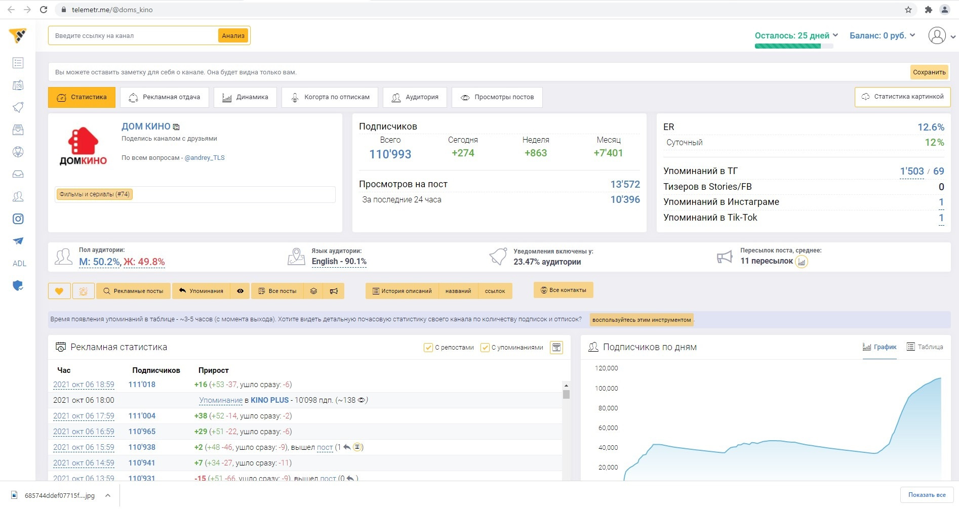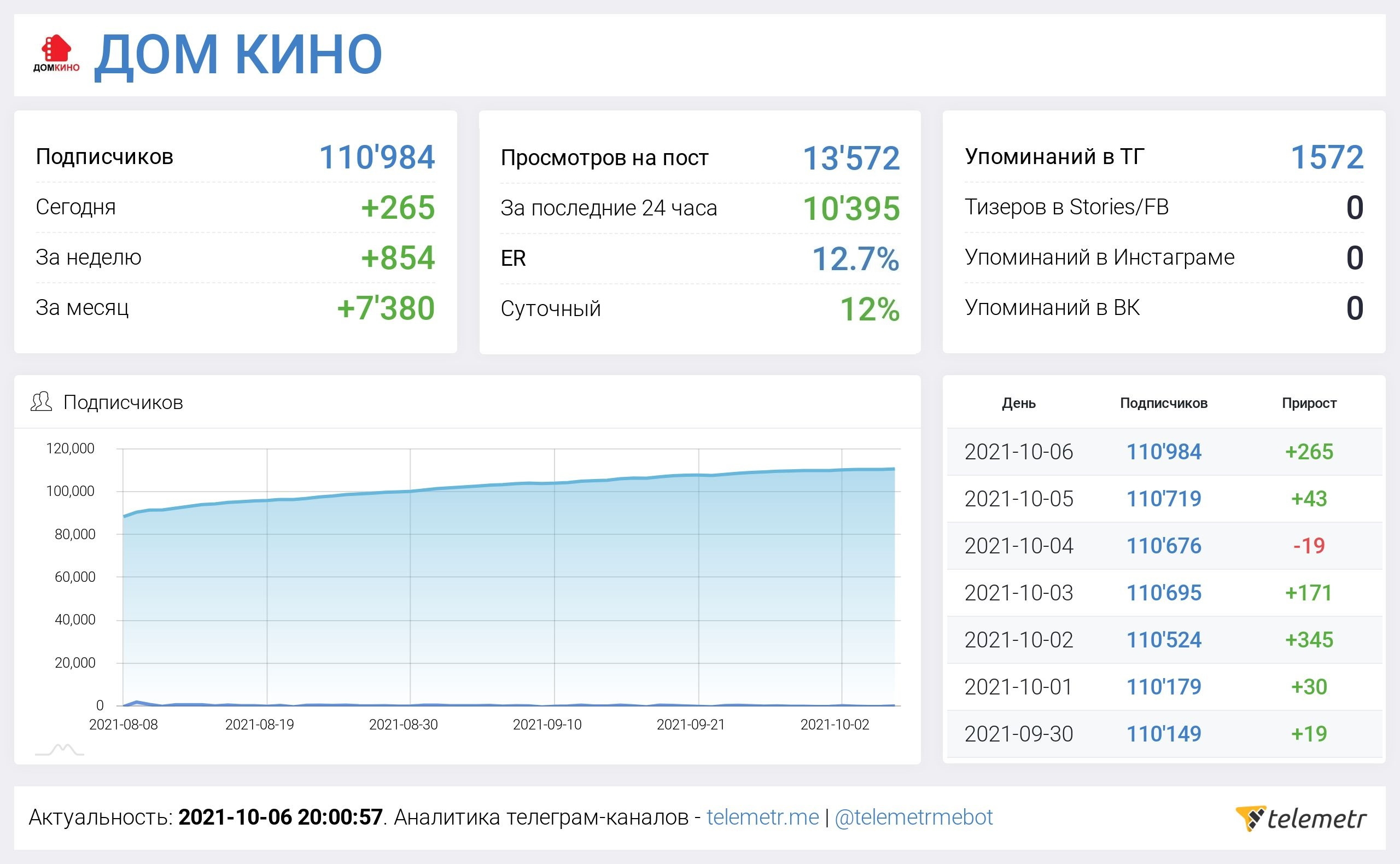 Телеграм канал с аудиторией более 110 000 человек в тематике «Фильмы»