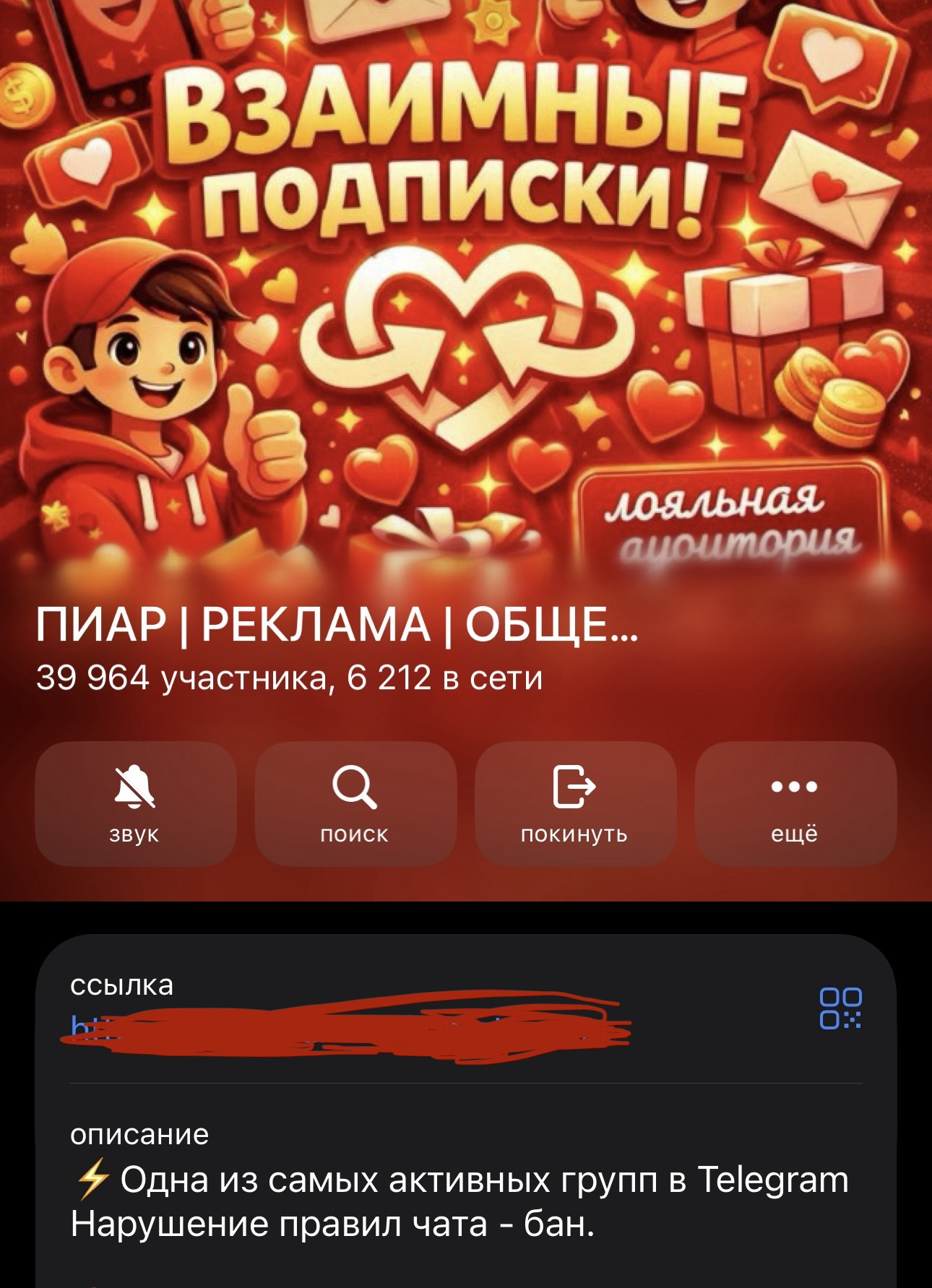 ????Продаю полностью активный чат взаимных подписок в Telegram!