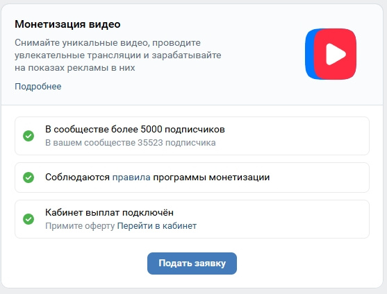 Способы монетизации: Прямая реклама, Донаты, Маркет-платформа, VK AdBlogger, сторонние биржи. Есть возможность подключить ПП и Видео монетизацию.