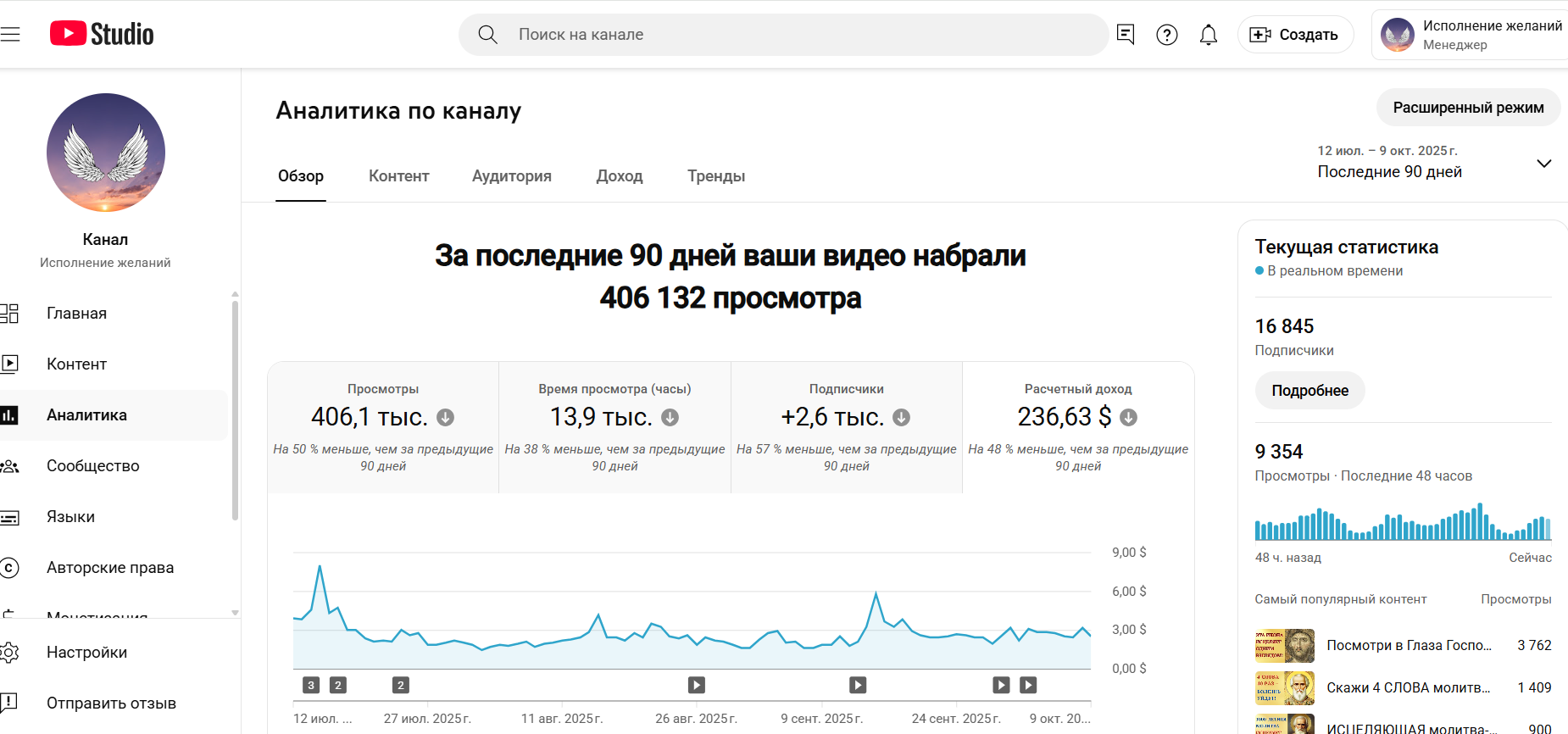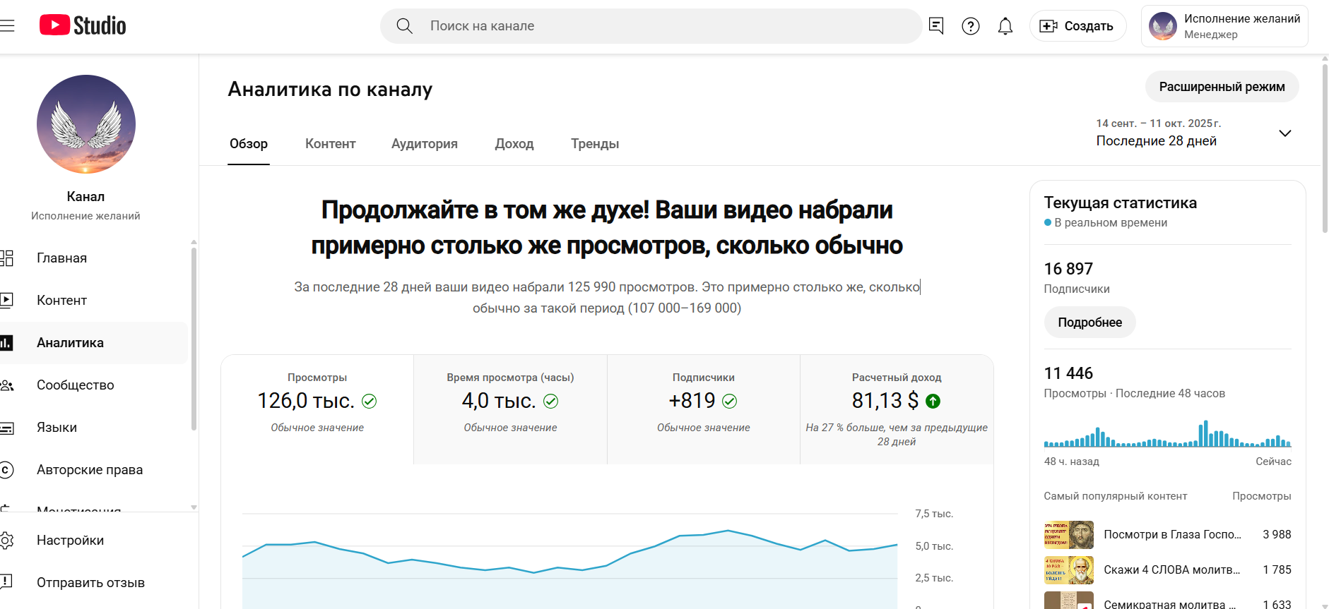 Контент канала - видео с православными молитвами. Открыт 8.10.24 г., монетизация от партнерской программы началась с 14.02.25. Число подписчиков на 18.10.25 - 17 000.